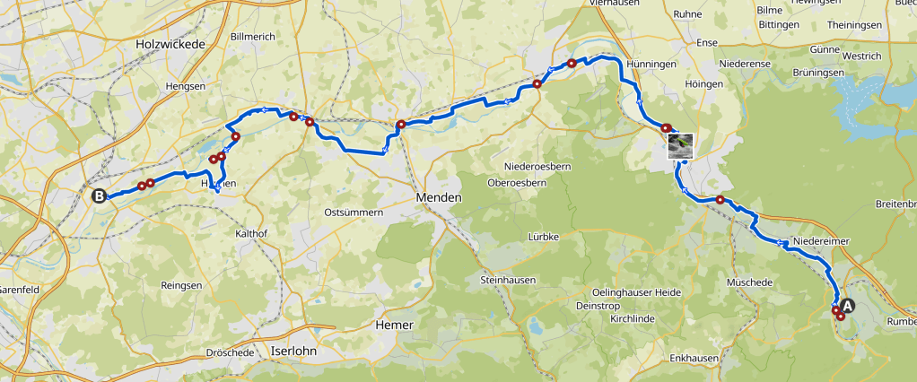 Vor Wickede wickele ich mich über eine Brücke mit Bollerwagen-Gegenverkehr und muss dann die Tour nachladen. Weil ich mit einer halben Tour angefangen habe in Meschede, passen die Etappen nicht zu einander und mir bleibt immer eine halbe Tour übrig. In Wickede habe ich vor vier Jahren etwas zu essen gesucht, daher weiß ich wo ich jetzt etwas bekomme und fahre über die andere Brücke gleich wieder raus. Es ist der 1. Mai und langsam wird es ungemütlich. Größere Menschenmengen mit Bier und Bollerwagen blockieren die Strecke. So ganz nüchtern sind ja auch nicht mehr.