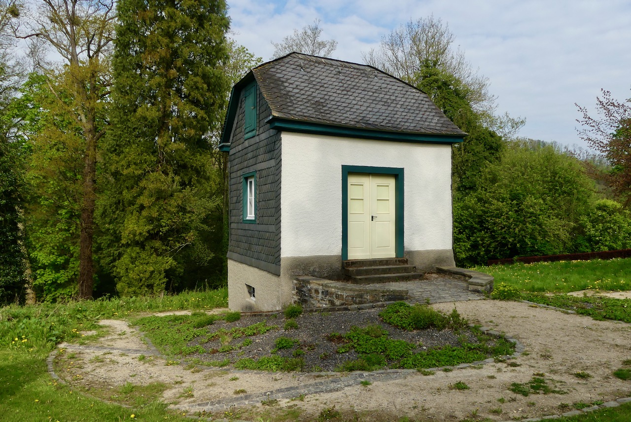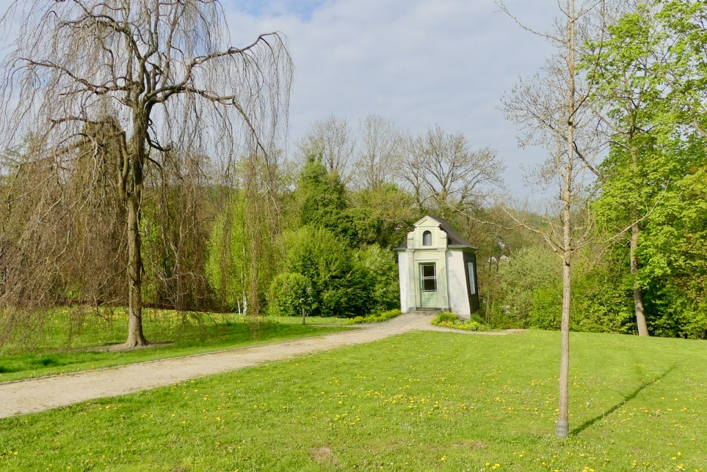 1. Mai : Als ich aus Arnsberg heraus fahren will, lande ich zuerst in einem kleinen Park mit klassizistischen Gartenhäuschen, wo ich zunächst noch verweile.