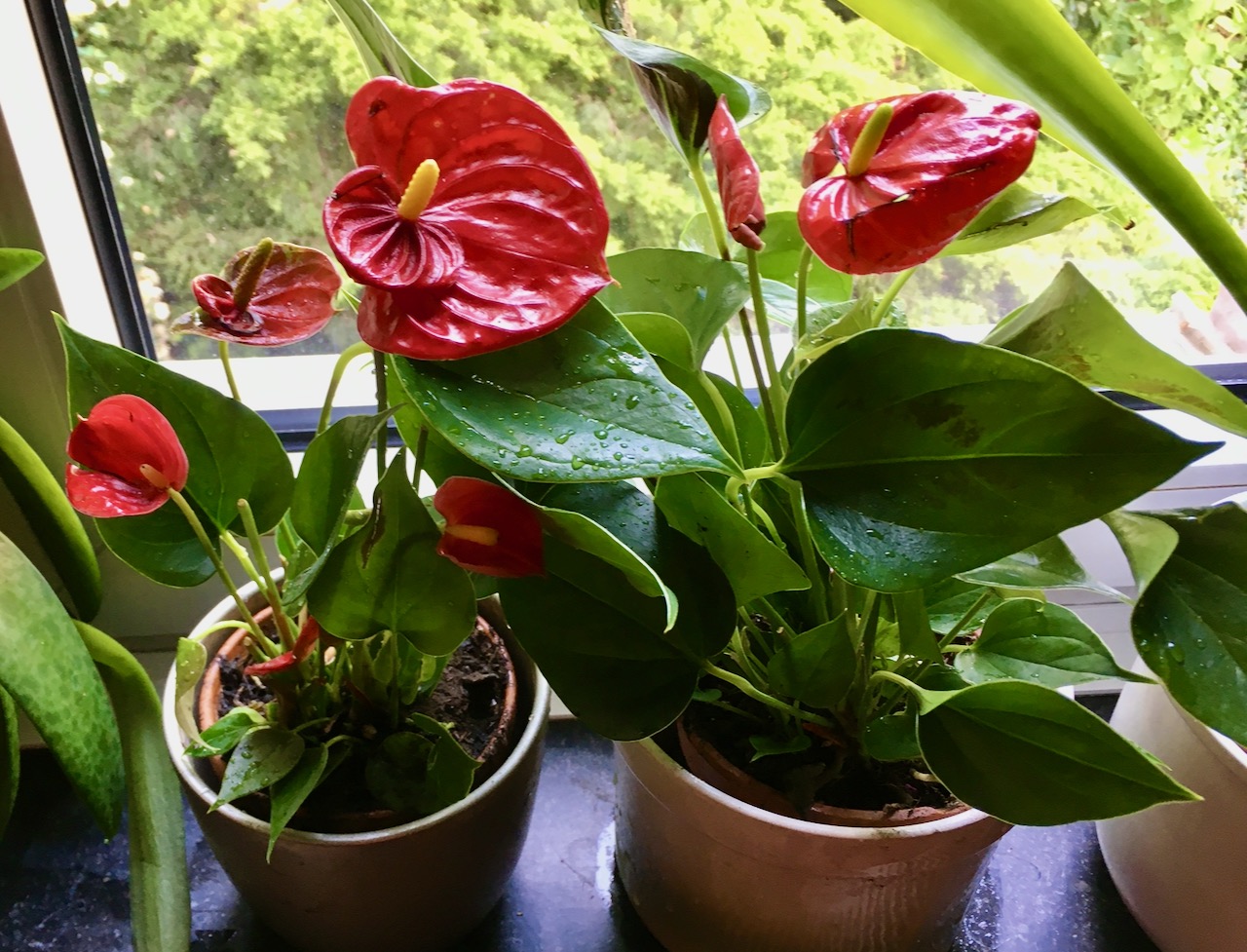 Aber am offenen Bücherschrank hatte jemand die floralen Reste von Muttertag hinterlassen. Neben mehreren Blumensträußen auch die beiden kleinen Anthurien. Salzstangenpflanzen habe ich als Kind die genannt. Nach Erstversorgung: Neuer Topf, Erde, abgestorbene Teile entfernt stehen sie jetzt auf der Fensterbank im Wohnzimmer. Hoffentlich ist es ihnen schattig genug.