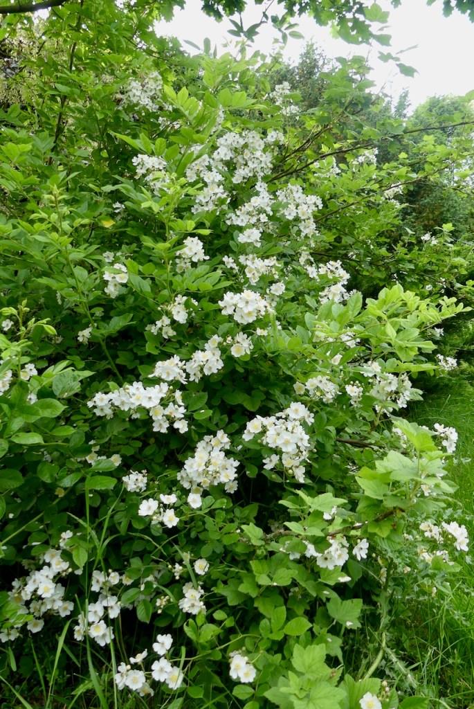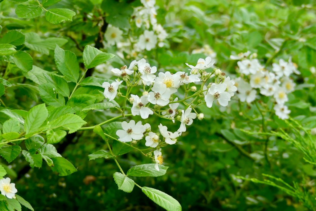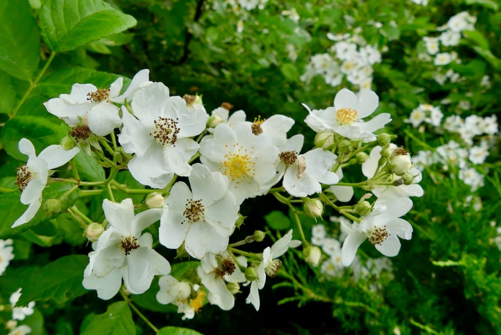 Den Blättern nach eine Rose, dem Duft nach eine Rose, aber so gut wie keine Stacheln und viele kleine Blütentrauben. Es hat kaum Ähnlichkeit mit den anderen Rosen im Garten. Weder mit den Zuchtrosen noch mit den wilden. Es könnte sich um eine Büschelrose handeln.