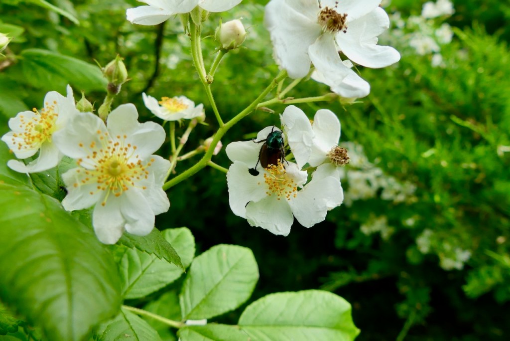Ein Rosenkäfer hat sich auch schon eingefunden. Riecht gut, sieht gut aus, stachelt nicht, ja, darf bleiben. Jetzt bin ich gespannt auf die Früchte.