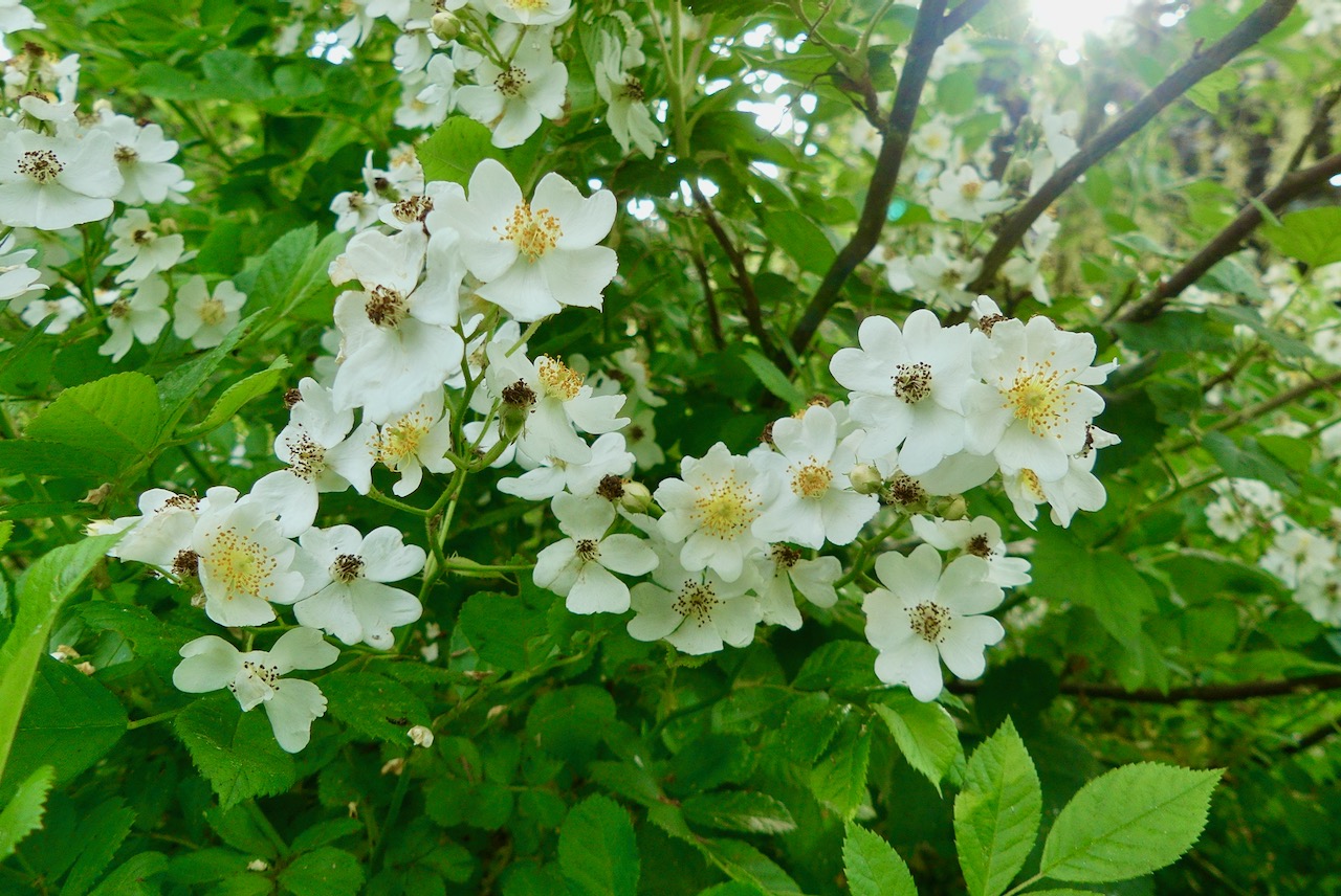 Den Blättern nach eine Rose, dem Duft nach eine Rose, aber so gut wie keine Stacheln und viele kleine Blütentrauben. Es hat kaum Ähnlichkeit mit den anderen Rosen im Garten. Weder mit den Zuchtrosen noch mit den wilden. Es könnte sich um eine Büschelrose handeln.