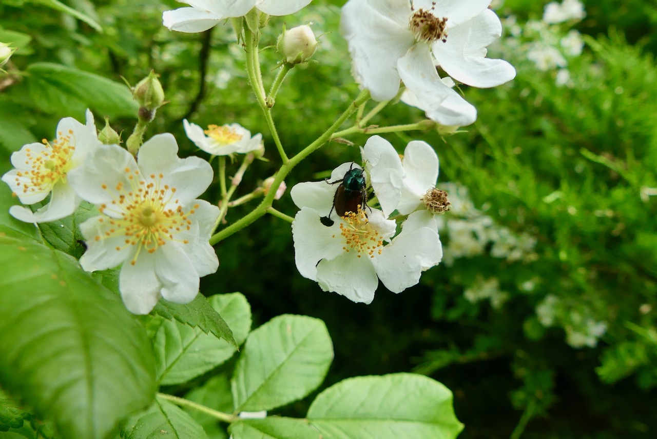 Ein Rosenkäfer hat sich auch schon eingefunden. Riecht gut, sieht gut aus, stachelt nicht, ja, darf bleiben. Jetzt bin ich gespannt auf die Früchte.