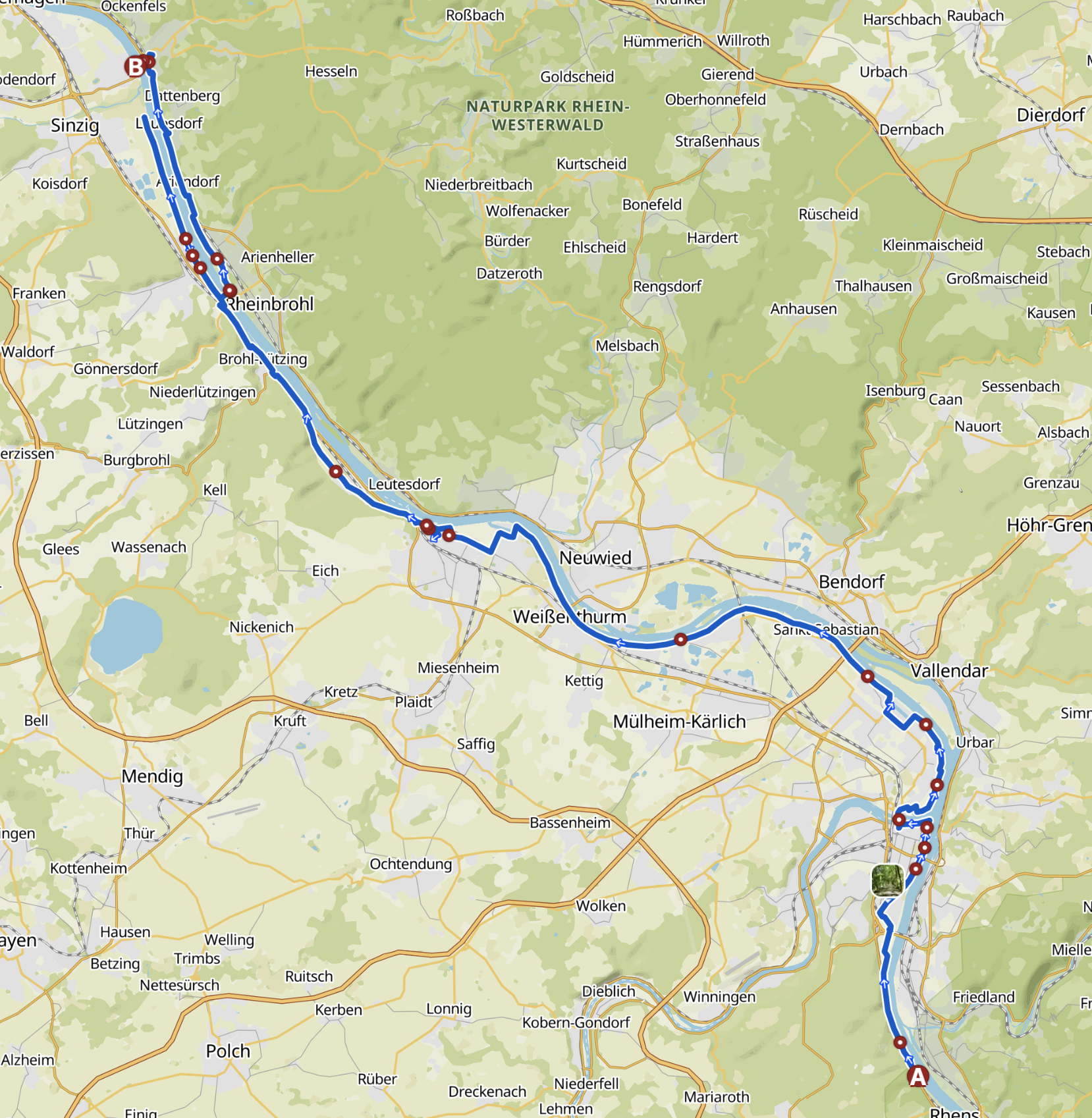 Eine Weile geht es ruhig am Rhein lang. Ich überlege kurz, ob ich in Weißenthurm schon pausieren soll, rollt aber gerade so gut.