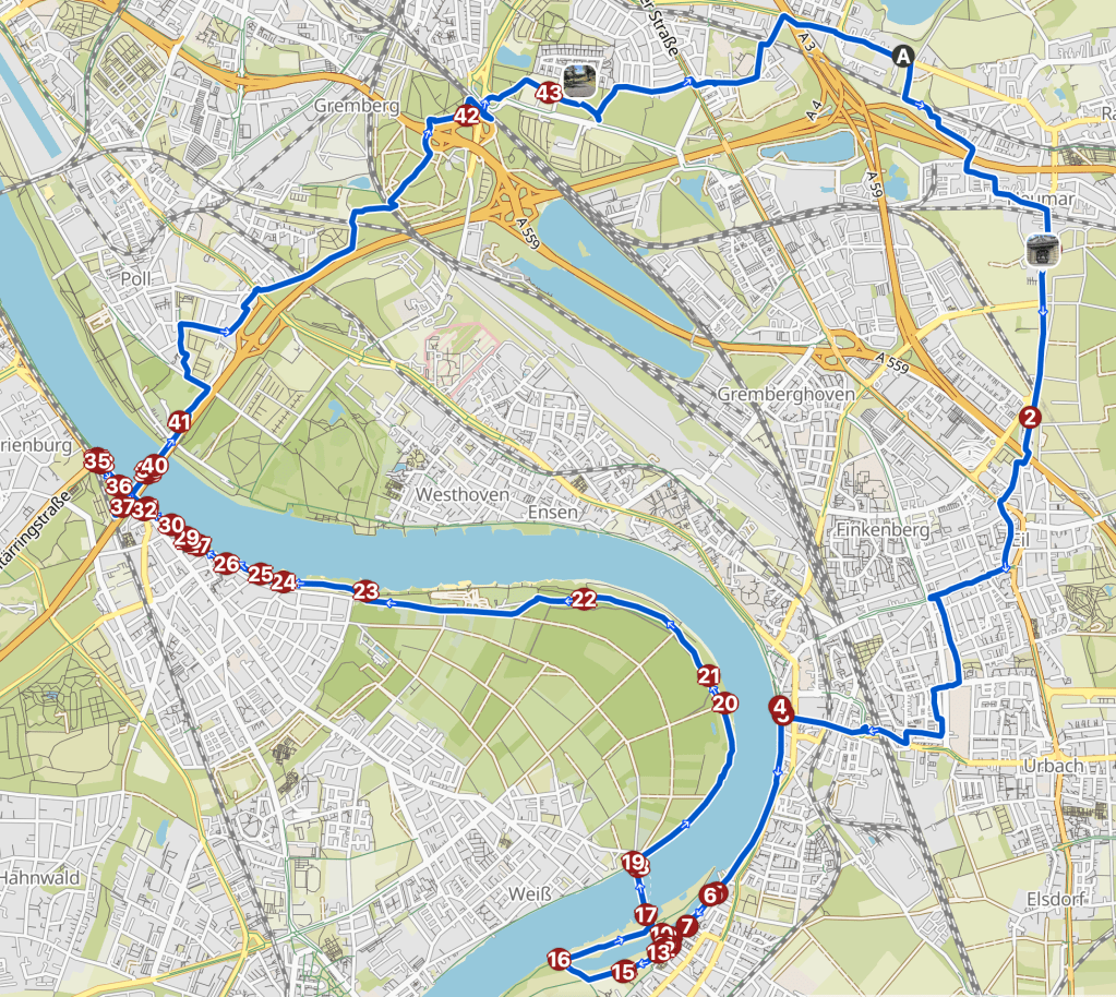 Die Strecke verfeinern ab Eil funktioniert. Anstelle des hubbeligen offiziellen Radwegs kann man auch durch ruhige Wohnstraßen fahren, die Frankfurter Straße und die Hauptstraße in Porz vermeiden und ich finde sogar einen kleinen Grünzug. Nachdem ich die Post ausgetragen habe, komme ich zügig am Rhein und an der Groov an.