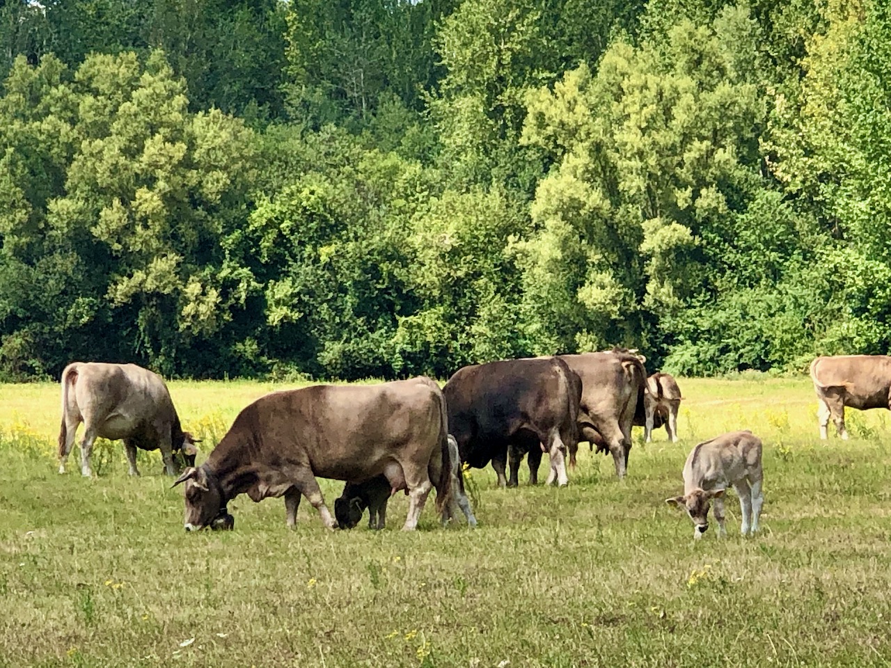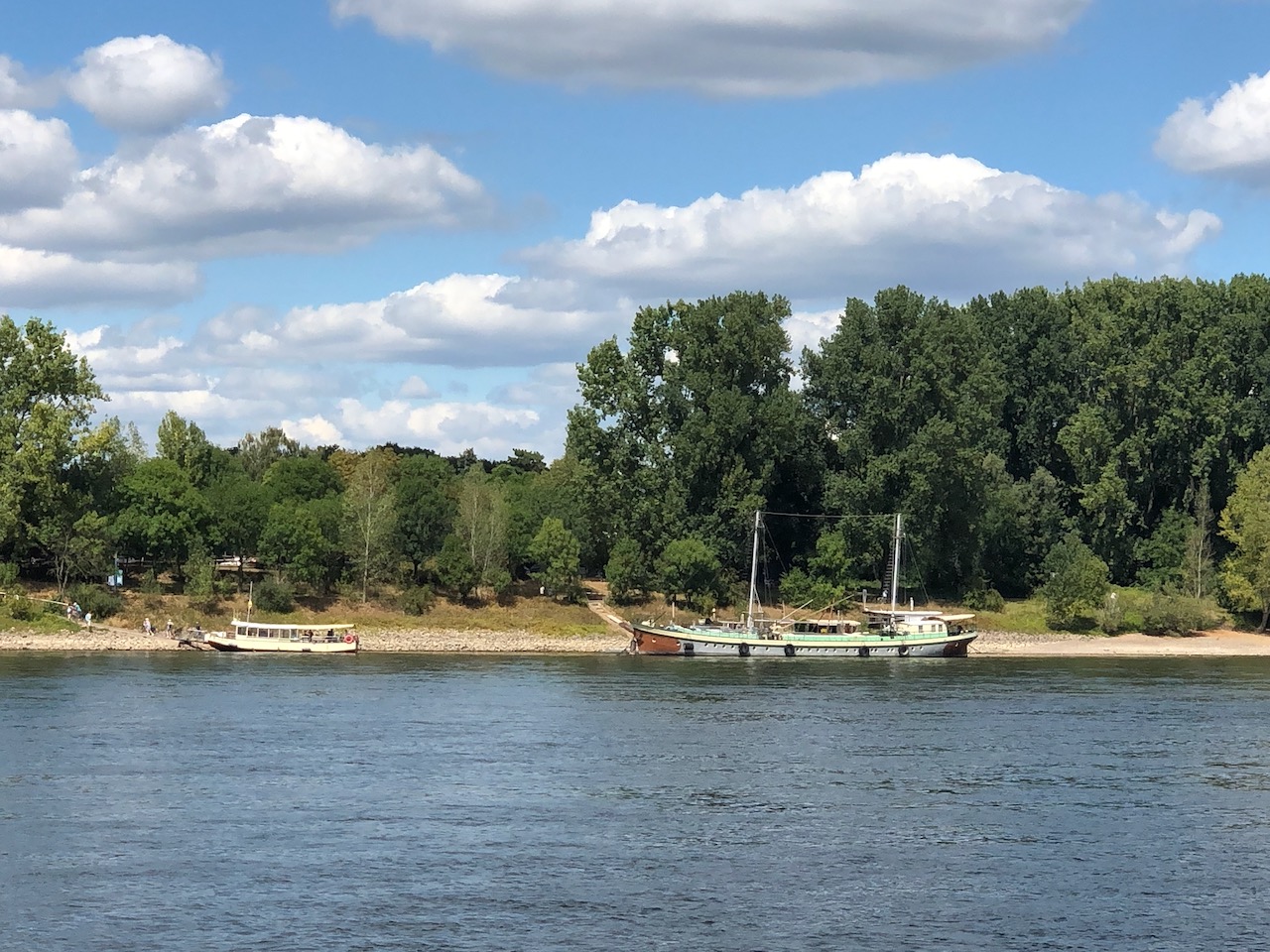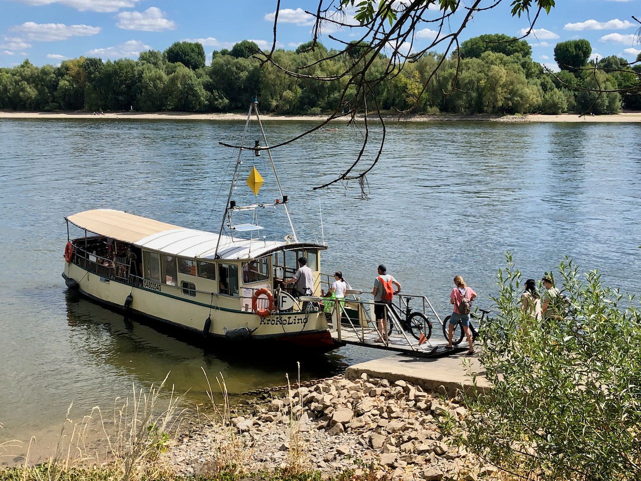 An Krokolinos Steuerrad steht jedoch heute ein junger Schipper. Am anderen Ufer erwartet mich Neuland: Der Weißer Bogen ist noch ein blinder Fleck auf meiner Fahrradkarte. Hier ist es ruhiger als auf der Zündorfer Seite. Nach Aufforstungen und Überschwemmungen ist ein Auwald entstanden. Aber erstmal läuten die Glocken. Kuhglocken!