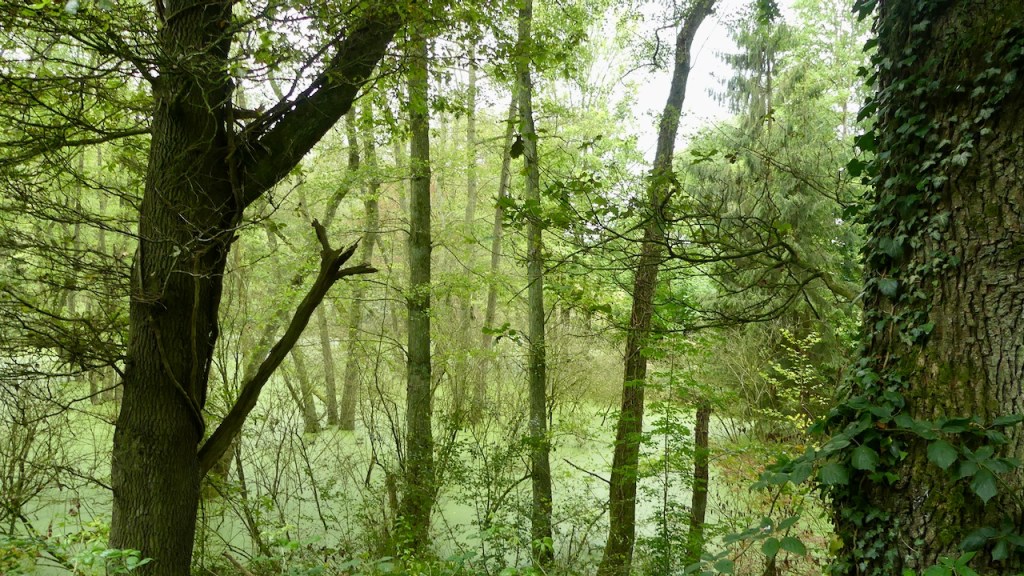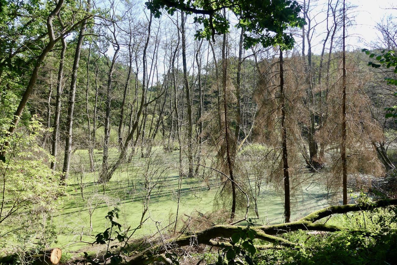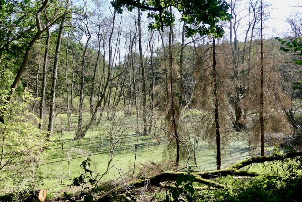 Damals hielt ich den See für einen Rest der Flut im Juli. Einige Spaziergänger sagten, dort sei früher der Broichbach durch gelaufen und jetzt sei wohl der Abfluss verstopft. Die Bäume sind übrigens nicht wegen Trockenheit und Hitze abgestorben, sondern weil sie mit den Wurzeln tief im Wasser stehen. Auch das halten die wenigsten lange durch.