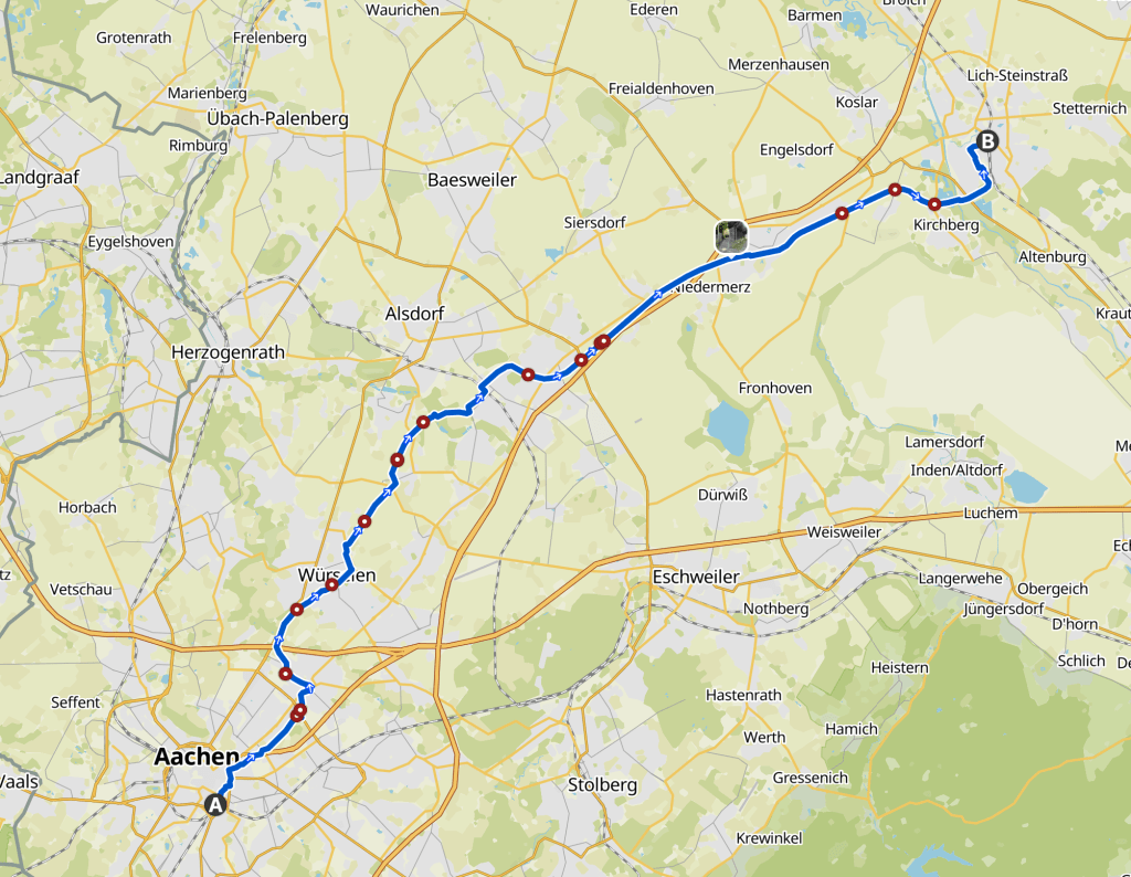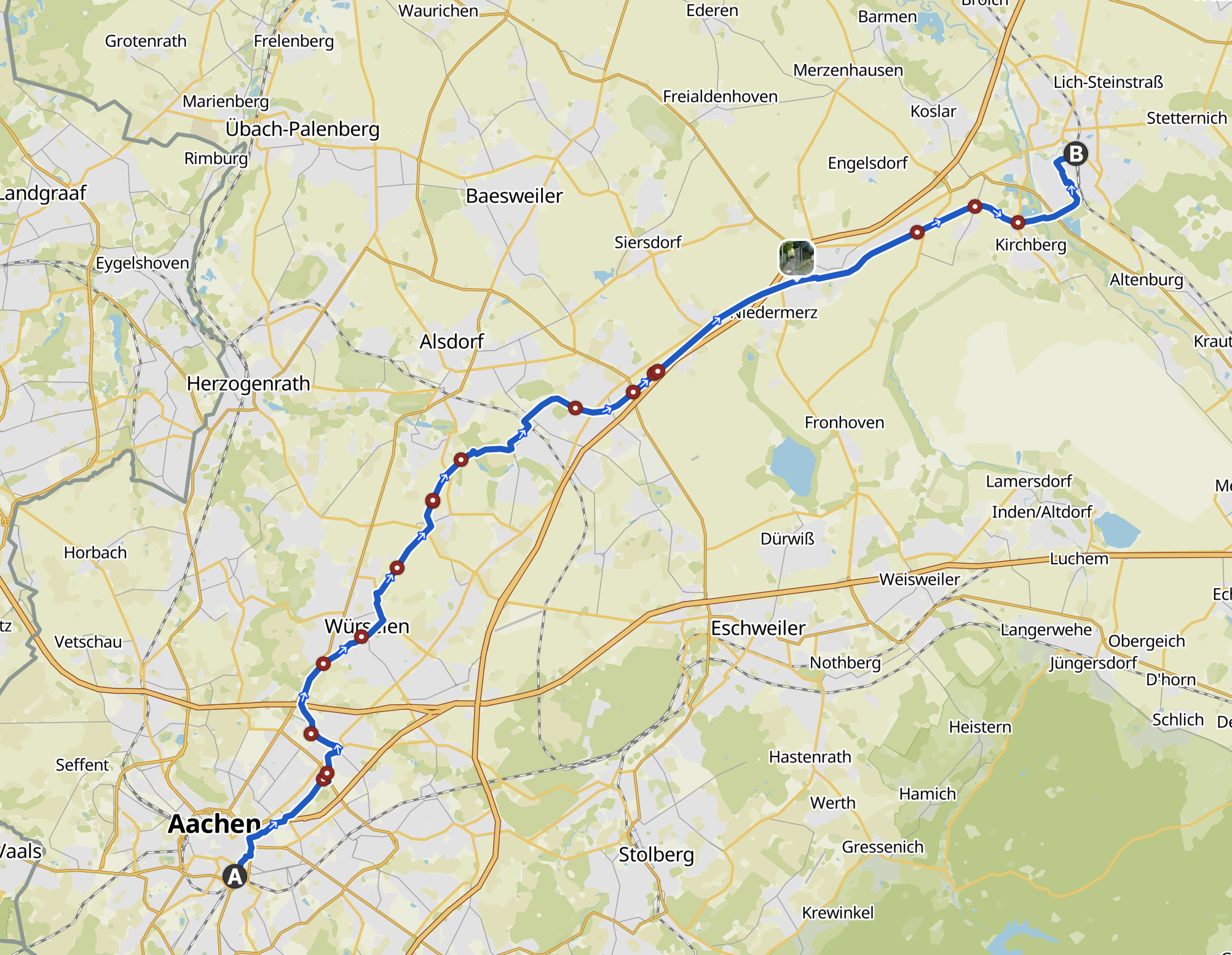 Ich entscheide mich also für die sichere Variante: Aachen Jülich über die bekannte Bahntrasse und dann an der Rur lang Richtung Roermond usw.