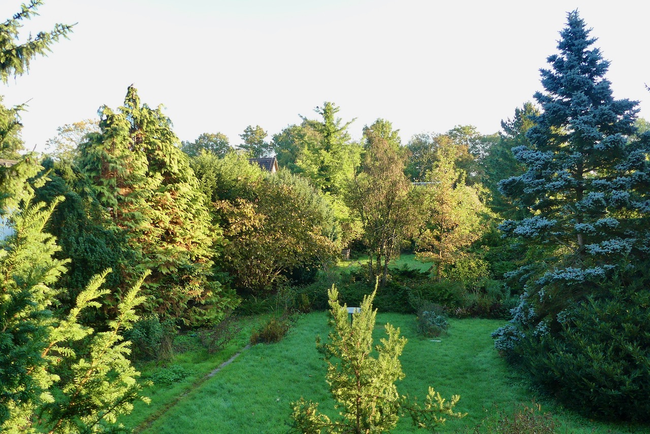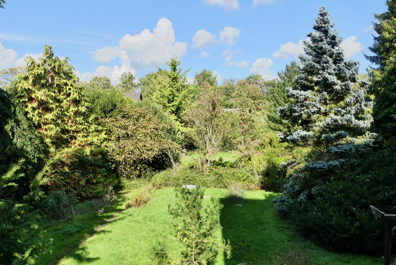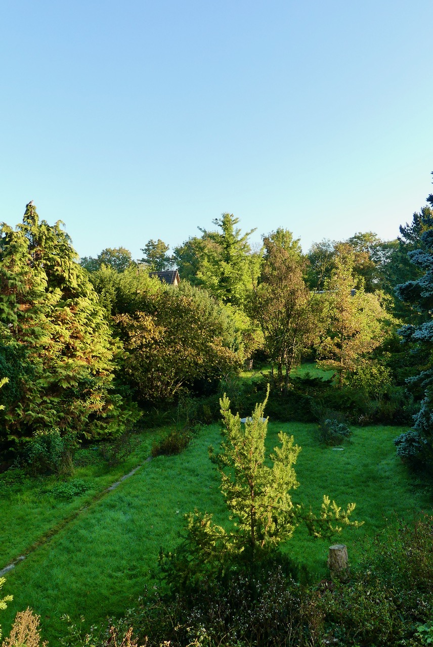 Anfang September dann Temperatursturz und viel Regen. Und schon ist alles wieder grün. Außerdem liegt Morgens und abends der Garten noch im Schatten und auf den Fotos, die ich gestern Mittag gemacht habe, sieht man, dass auch das Haus seinen langen Schatten wirft.