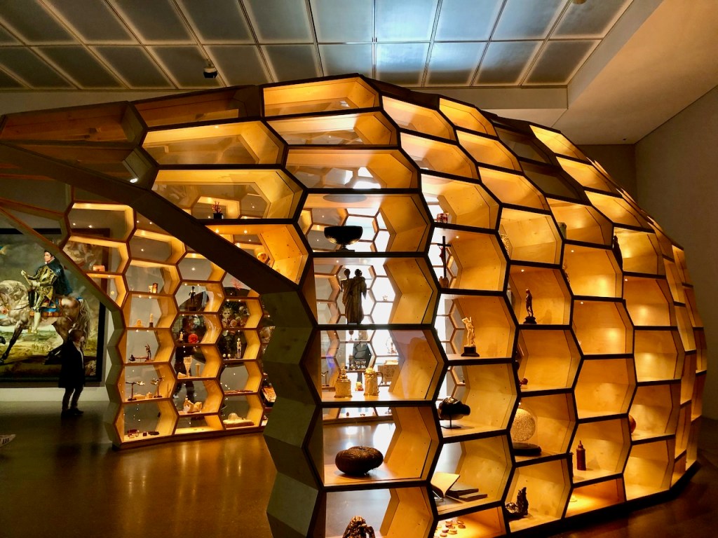In den Waben der Vitrine „Helmet“ des Kubanischen Künstlerduos los Carpinteros und drumherum befinden sich allerhand Objekte zum staunen und gruseln.