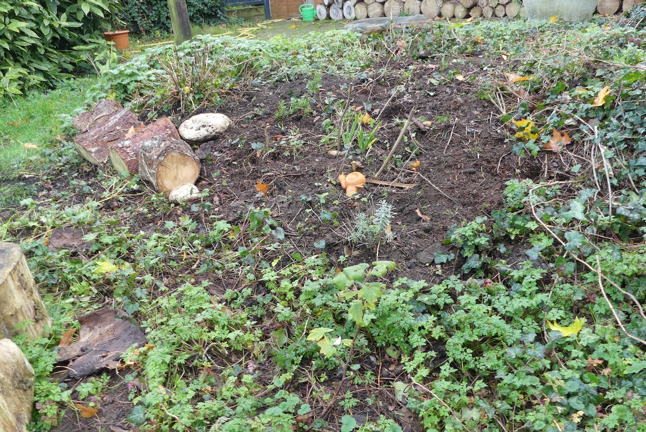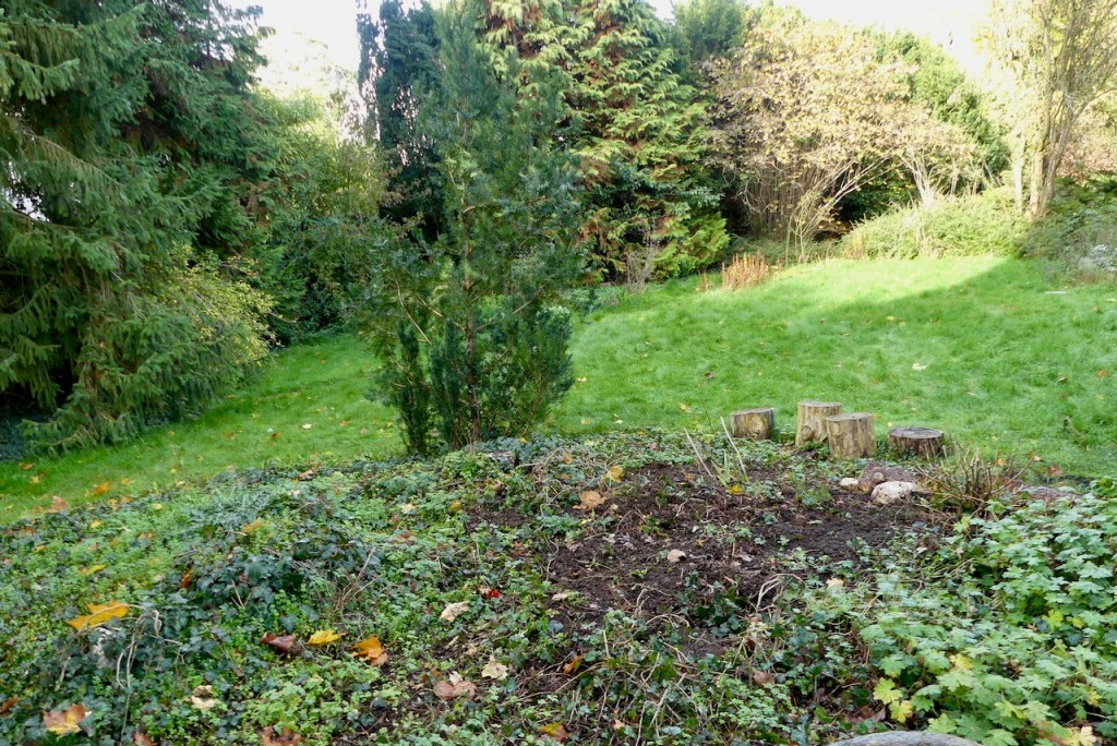 Ein Jahr lang habe ich nach den Baumfällungen die neu entstandene Freifläche beobachtet: Wo ist Sonne, wo Schatten, was wächst freiwillig? Erst wuchs nix, dann stinkender Storchschnabel, Hohlzahn und Klebkraut. Efeu ist etwas weniger geworden.