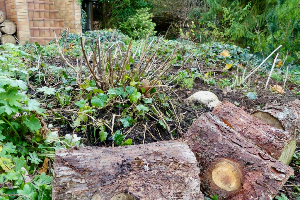 Die Eibe bekam nebenbei einen Fassonschnitt verpasst. Im Gegensatz zu anderen Koniferen verträgt Eibe gut einen Schnitt. Weil sie ja unterhalb der Fichten stand, ging ihre Hauptausrichtung nach Norden zum Licht und sie hatte seitlich zwei sehr lange Triebe, die jetzt immer im Wind wehten. Ein Ast war beim Fichtenfällen abgeknickt worden.