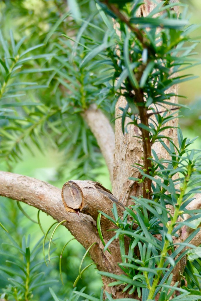 Die langen Seitentriebe habe ich gekürzt und den abgeknickten Ast entfernt. Daneben ist auch scho ein neuer Trieb ausgeschlagen. Die Eibe hat auch bemerkt, dass das Hauptlicht jetzt von der anderen Seite kommt und die neuen Triebe nach Süden gedreht, was zunächst mal seltsam aussieht.