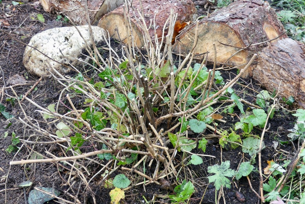 Nun hat mich der Ehrgeiz gepackt: Die Hortensie, die seit Jahren vor sich hin kümmerte, wurde aus ihrem hässlichen Kübel befreit und an den Hang gepflanzt. Packt sie es, nächstes Frühjahr? Links oben im Bild liegt auch einer der Steine, die ich wieder ausgegraben habe.
