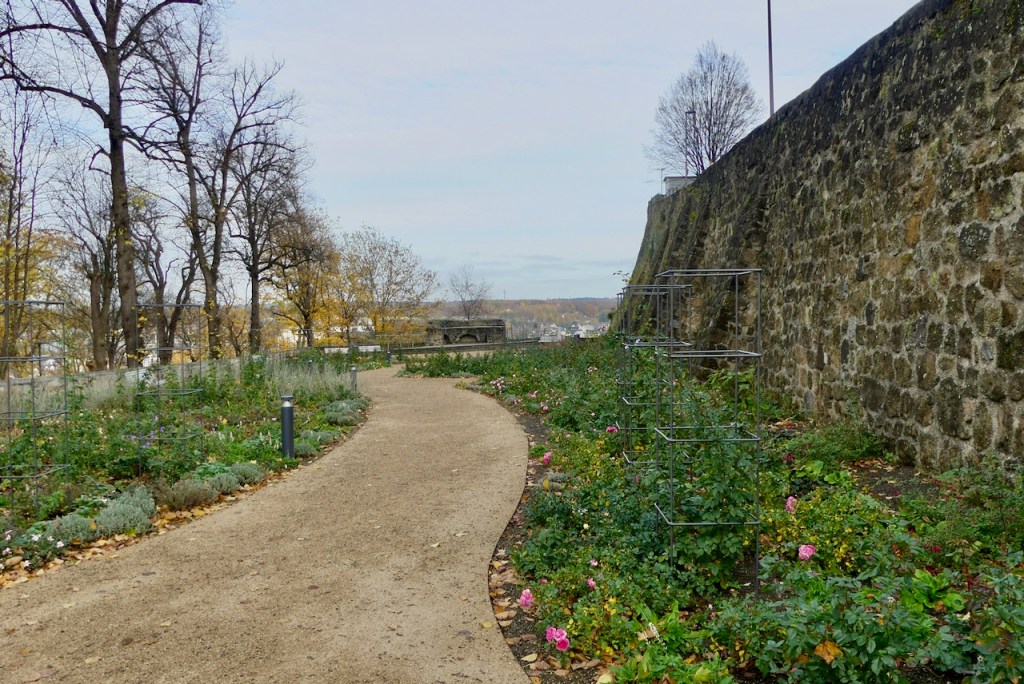 Unterhalb der Burgmauer, befindet sich ein Rosengarten und Reste der mittelalterlichen Befestigung. Hier blühen tatsächlich noch Rosen und Fuchsien.
