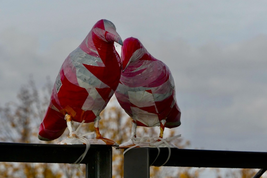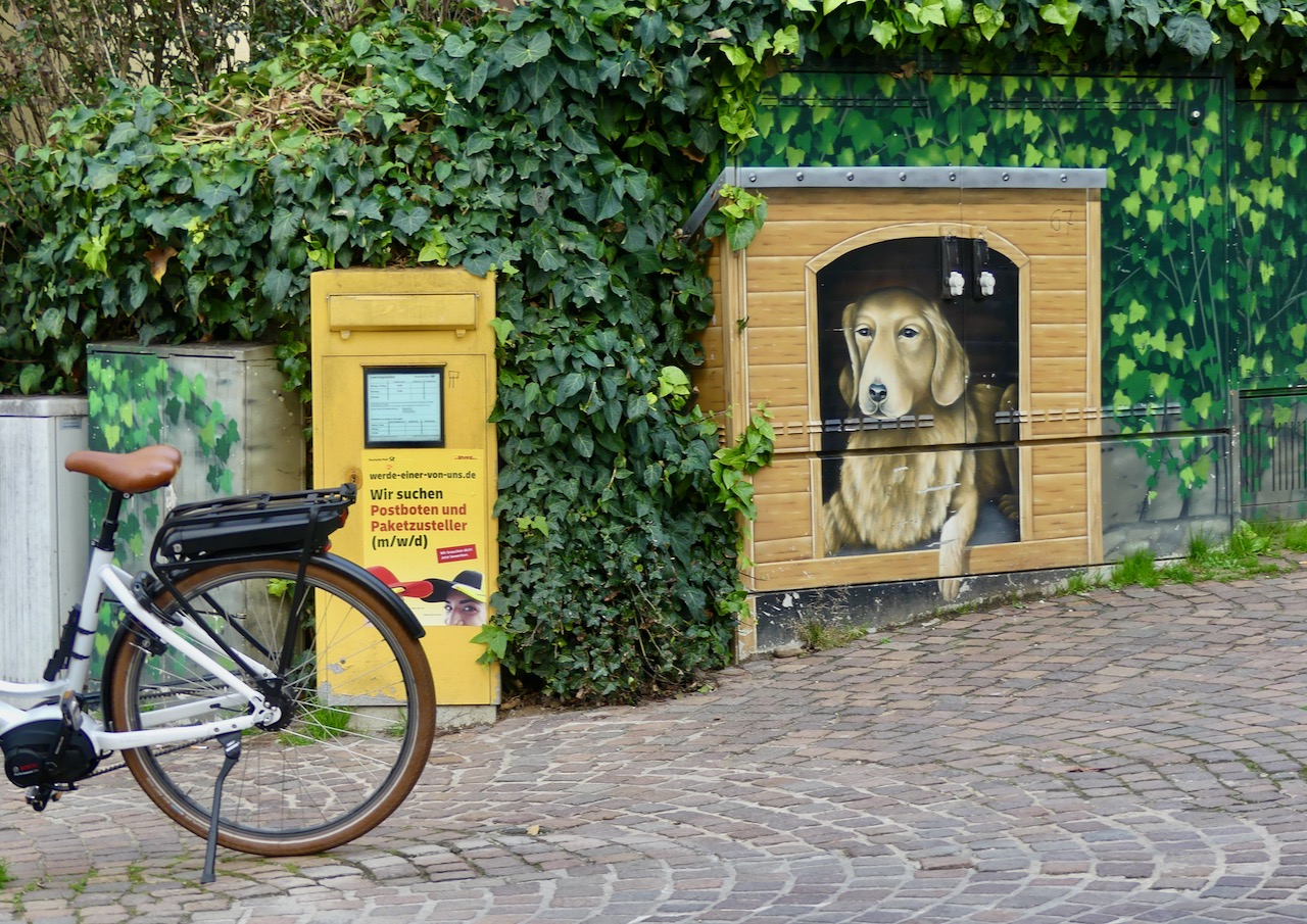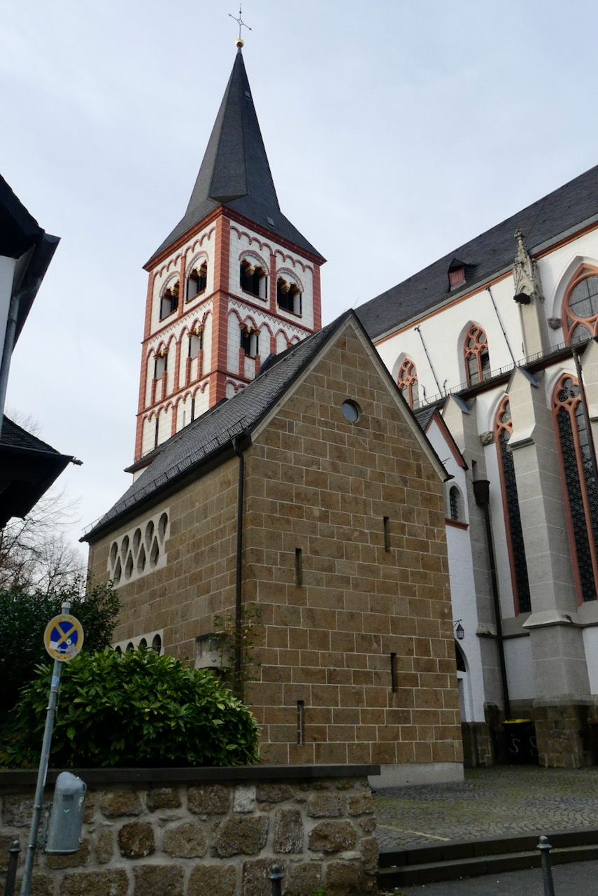 Von dort finde ich tatsächlich den Durchgang, an dem der Komoot aufgegeben hat. Zwischen dem Kloster und der Bausünde führt ein Durchgang zum Parkplatz. Ich bin also wieder da, wo ich vorher war und erst jetzt fallen mir die bunten Krähen auf. Ein ähnliches Paar sitzt auf der Rheinfähre zwischen Wesseling und Niederkassel.