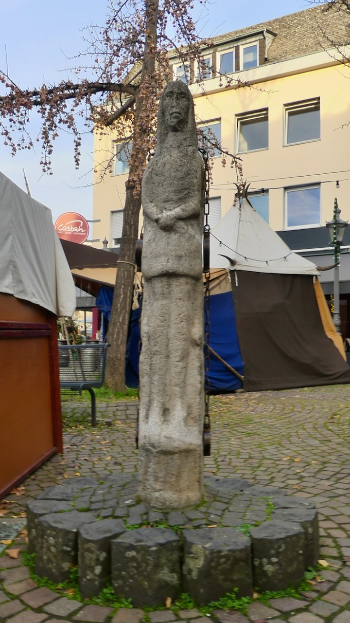Vorbei an St. Servatius. Ist der Hund verantwortlich dafür, dass Postboten und Paketzusteller gesucht werden? Bis zum Schandpfahl am Marktplatz. Hier findet gerade der Mittelalterliche Weihnachtsmarkt statt. Die übliche Ansammlung von Fressbuden in mittelalterlicher Gewandung, mit erstaunlich wenig Weihnachtskitsch, aber auch ein bisschen Spektakulum. Kinder bewundern einen echten Schmied und üben sich im Bogenschießen. Es gibt auch einen Marktschreier und eine Bühne, auf der aber leider noch niemand aufspielt. Als ich zu Hause ankomme, ist es schon dunkel.