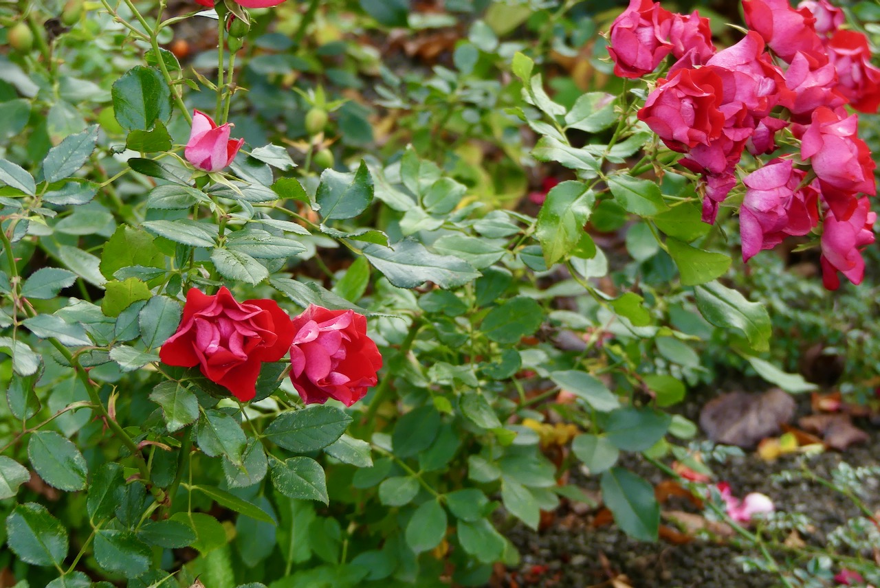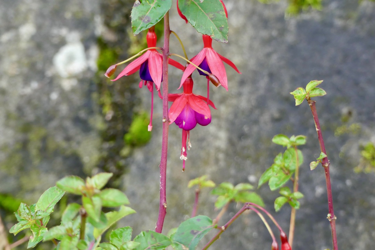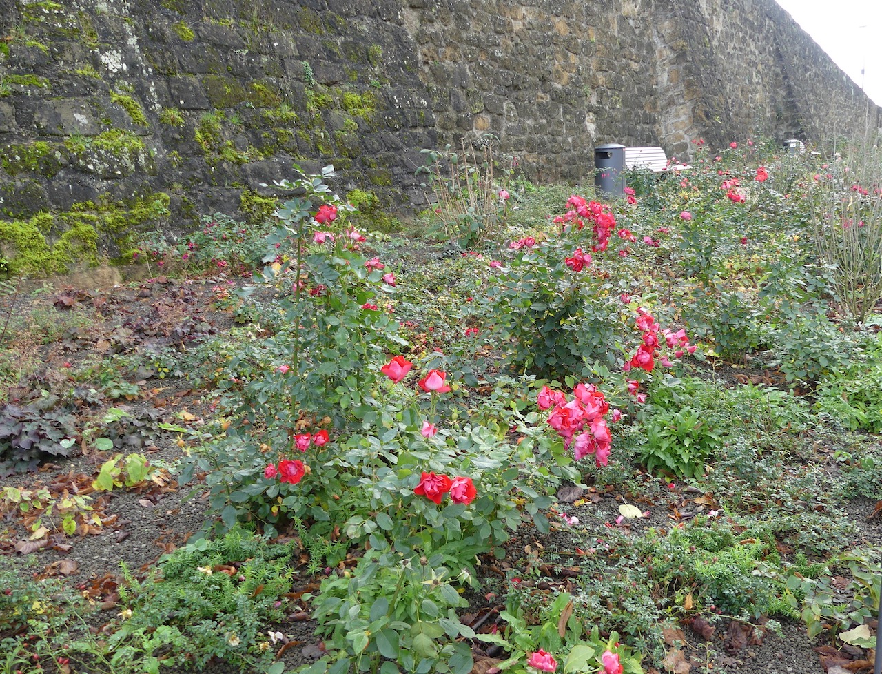 Unterhalb der Burgmauer, befindet sich ein Rosengarten und Reste der mittelalterlichen Befestigung. Hier blühen tatsächlich noch Rosen und Fuchsien.