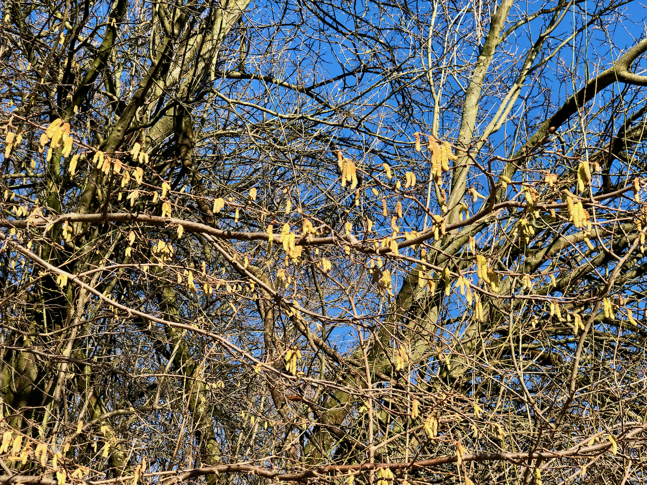 Hier blüht die Hasel und weiter geht es durch Kleingärten. Frisches Gemüse im Februar ist aber eher unwahrscheinlich