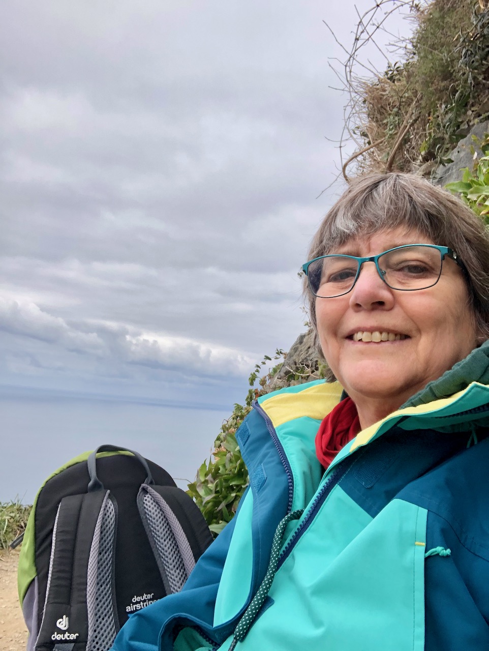 Nach einem kurzen Stückchen Straße kommt dieser herrliche Platz, eine kleine Steinbank, blühende Blumen und ein herrlicher Ausblick. Da grinse ich noch und mache mal eins der sehr seltenen Selfies. Mittlerweile ist Levanto hinter einem Abhang verschwunden.