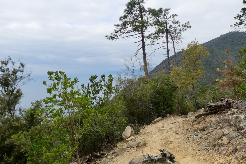 Jetzt wird es urig: Durch einen wunderschönen Steineichenwald geht es hoch hinauf. Nebenbei wird das Gelände auch schwieriger. Da ich wegen der Knie mit Barfußschuhen laufe, muss ich darauf achten, wohin ich die dünnen Sohlen setze. Mittlerweile wird mir auch bewusst, dass ich alles was ich hochlaufe auch wieder runter muss, und bei mir ist ja eher runter das Problem.