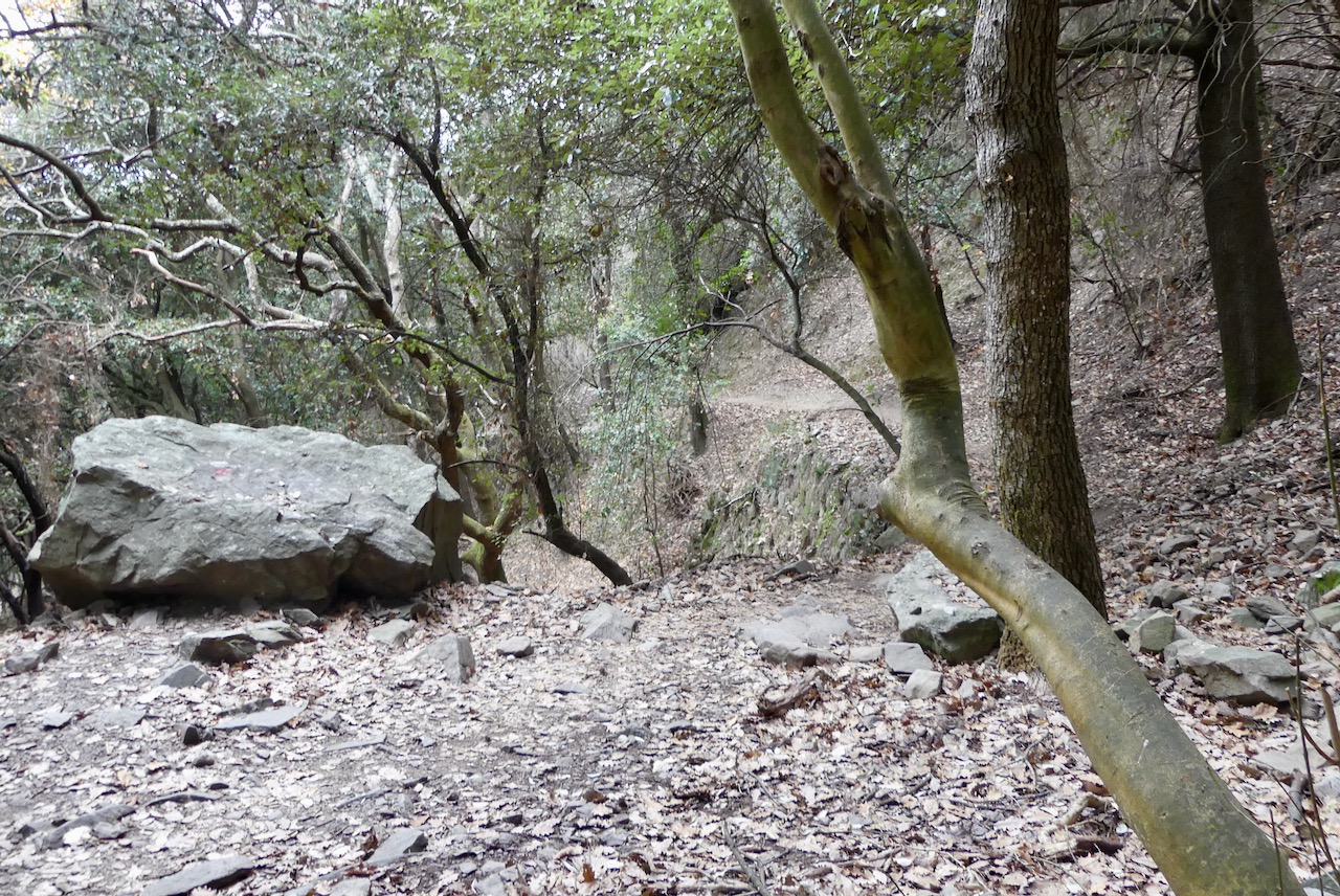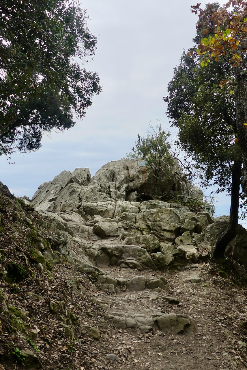 Jetzt wird es urig: Durch einen wunderschönen Steineichenwald geht es hoch hinauf. Nebenbei wird das Gelände auch schwieriger. Da ich wegen der Knie mit Barfußschuhen laufe, muss ich darauf achten, wohin ich die dünnen Sohlen setze. Mittlerweile wird mir auch bewusst, dass ich alles was ich hochlaufe auch wieder runter muss, und bei mir ist ja eher runter das Problem.