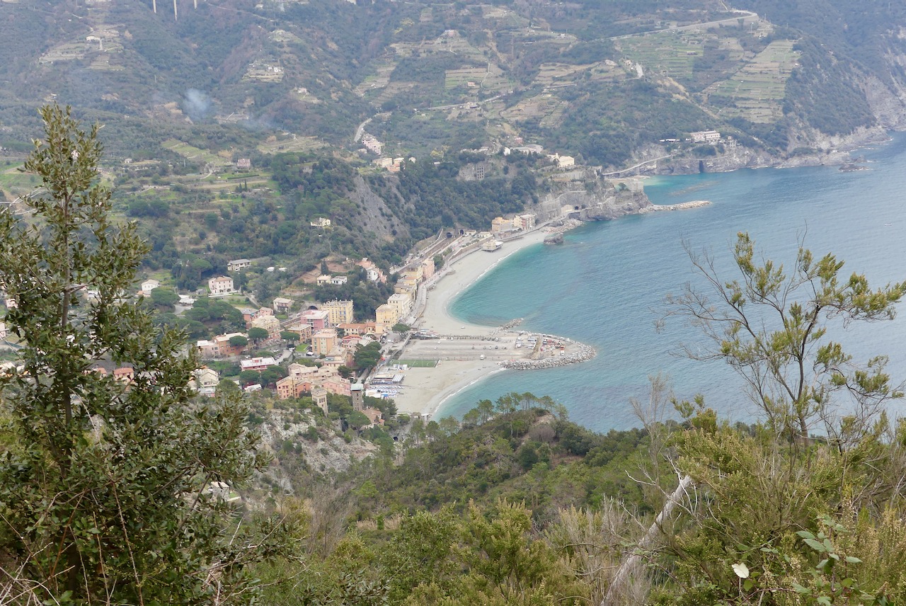 Es ging dann noch eine Stunde steil bergab. Unten angekommen stellte ich fest: Große Baustelle in Monterossso und weil es schon 15.30 ist, hat auch nur eine kleine Bar offen. Focaccia mit Zwiebeln ist aber lecker. Zurück nehme ich den Zug.