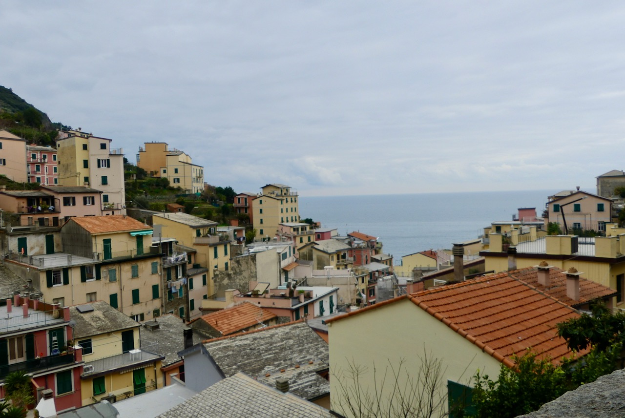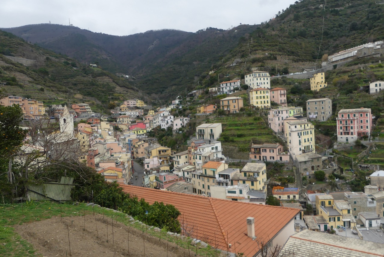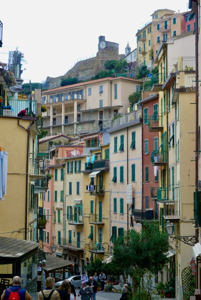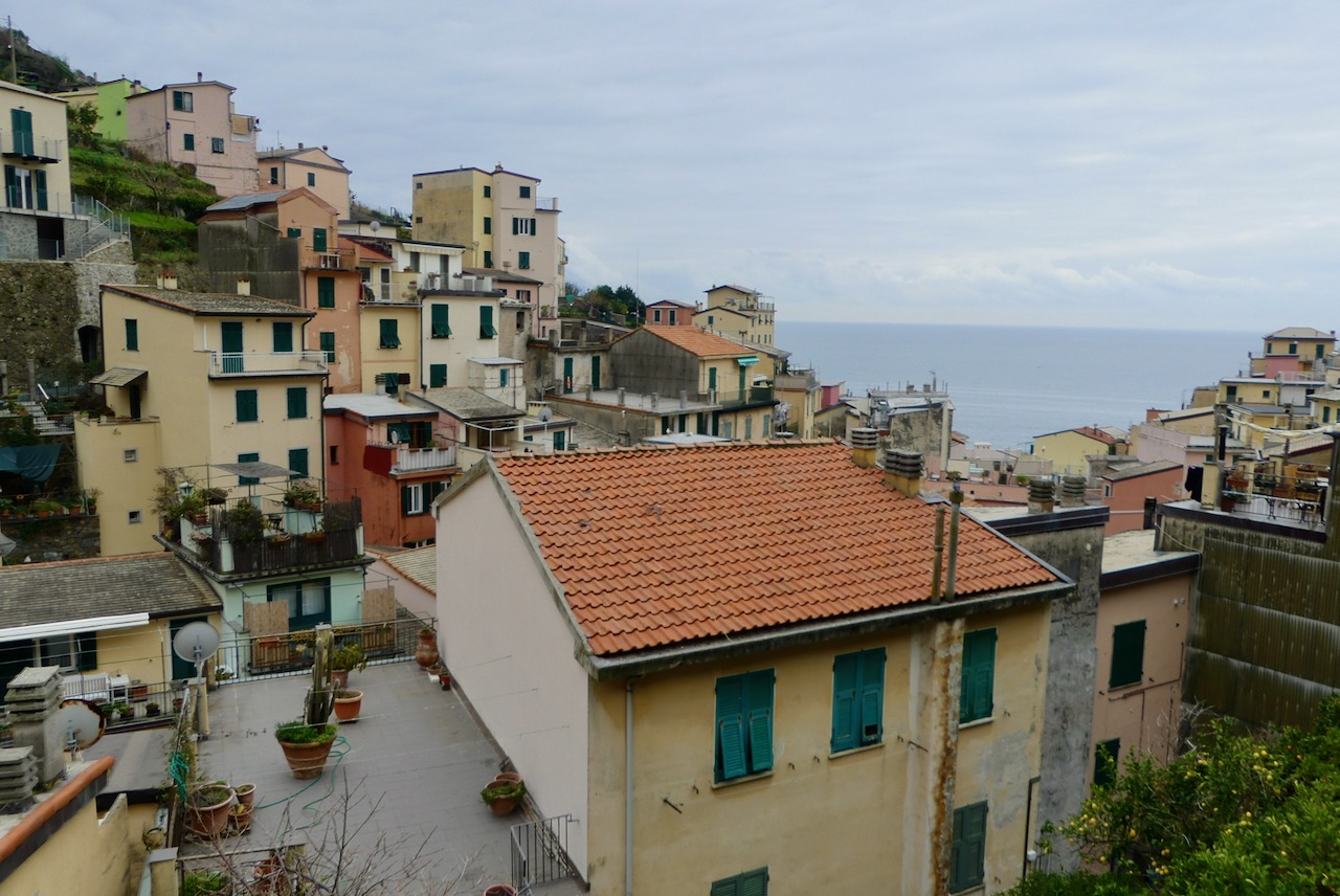 Auf den ersten Blick sind auch in Riomaggiore die Häuser bunt angemalt, aber die ausgeprägte Fassadenmalerei wie in Levanto oder Bonassola gibt es hier nicht. Dafür haben ein paar mehr Läden geöffnet. Wie in Monterosso gibt es Baustellen im Winter: Durchgang verboten.