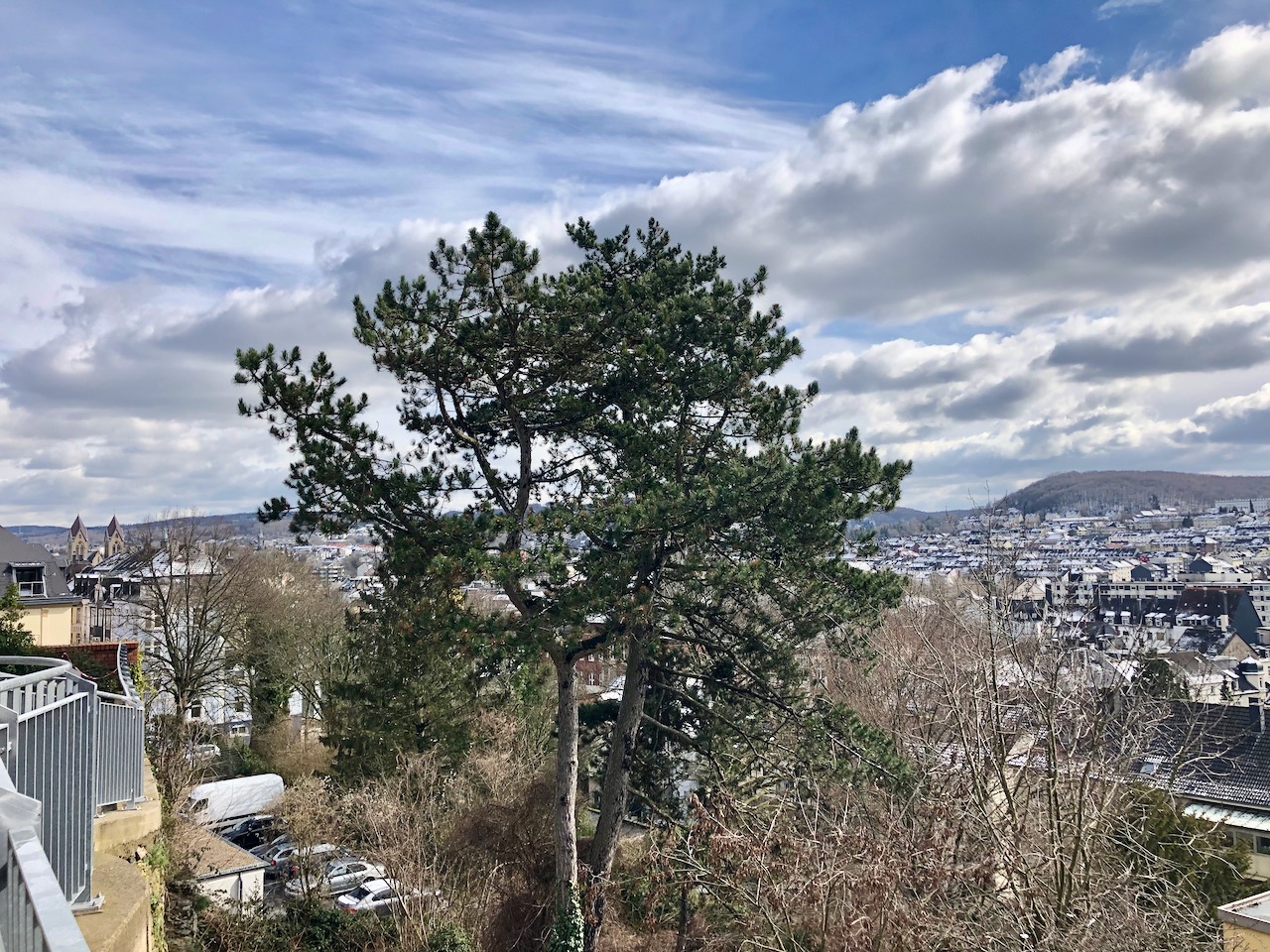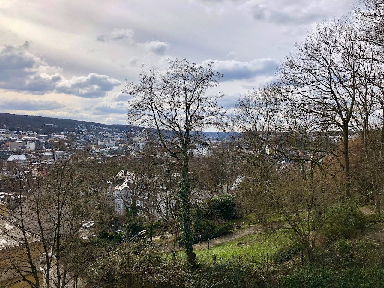 Gleich oberhalb der Nordbahntrasse liegt der Rast- und Aussichtsplatz Belvedere, ebenfalls ein Projekt der Wuppertalbewegung. Ein schönes Beispiel dafür, was Bürgerinitiativen bewegen können. Auf den Dächern liegt noch Schnee, aber es ist angenehm warm.