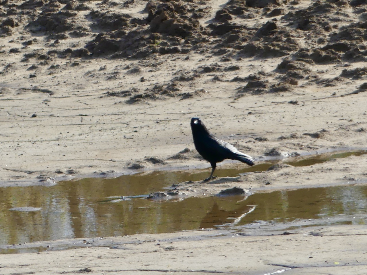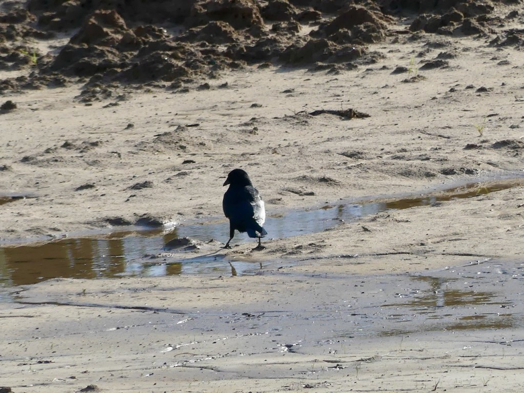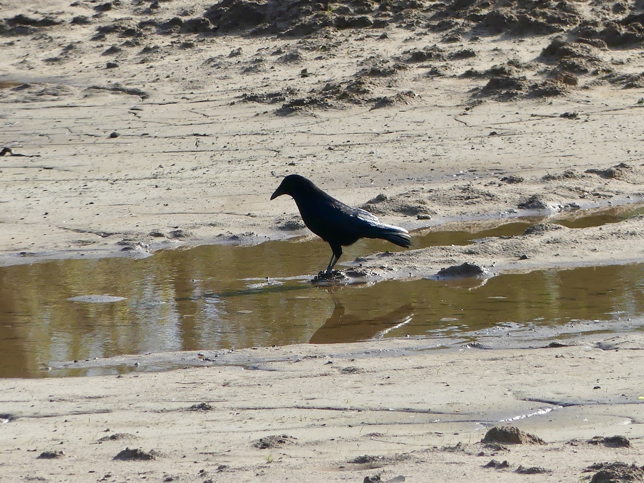 Nach ein paar Tagen ohne Regen ist ein Teil des Wassers verdunstet. Die Krähen scheinen fasziniert von der Pfütze. Treiben sie Bodenkunde oder suchen sie Essbares?