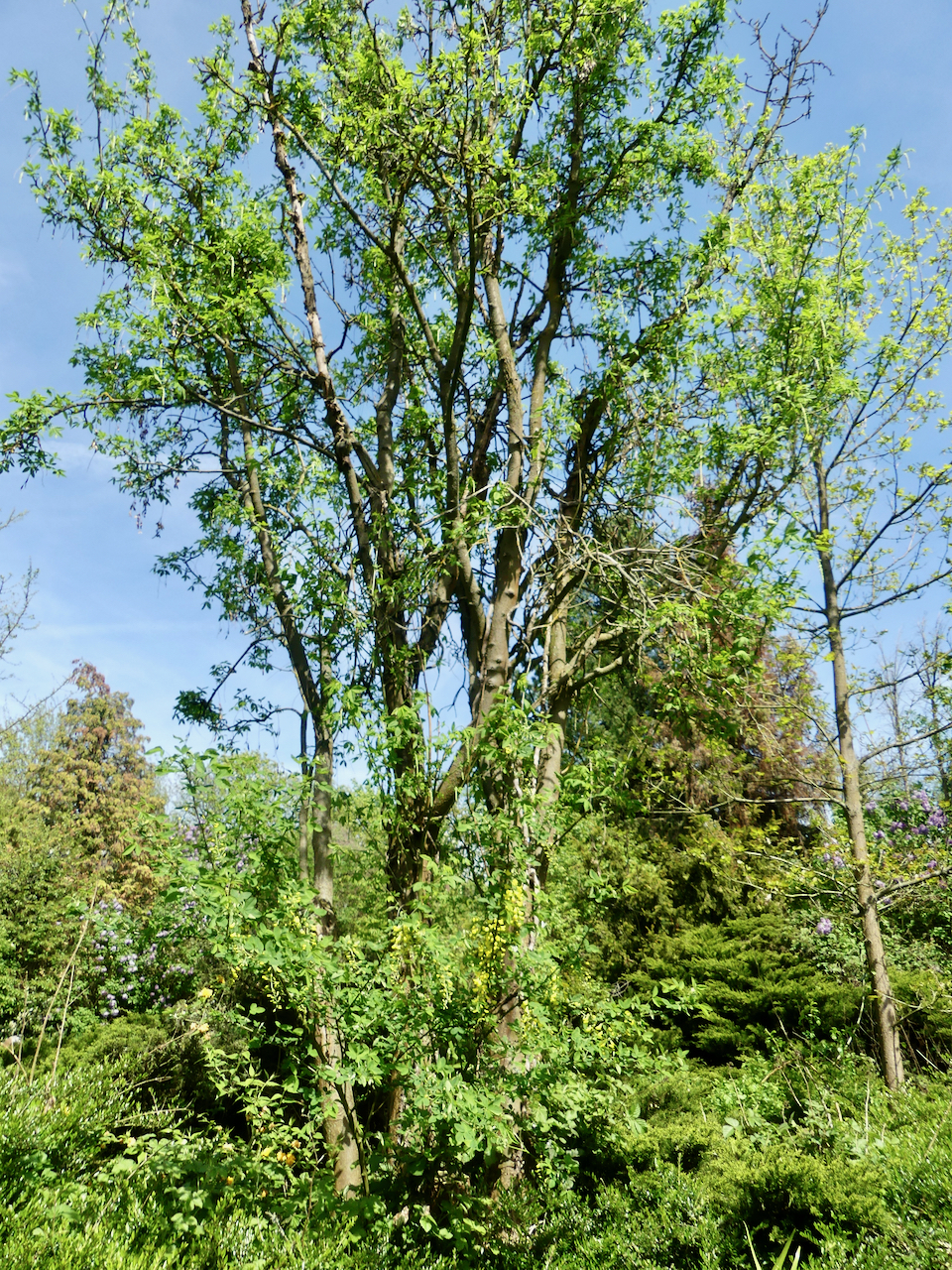 Der alte Goldregen baut schon ab, seit ich wieder hier wohne. Er hat seine natürliche Wuchshöhe erreicht. Die Lebensdauer des Goldregens beträgt etwa 20 Jahre. Die dürfte er auch schon erreicht haben. Anfangs dachte ich, er würde irgendwann komplett von Efeu überwuchert, aber weit gefehlt: Im Trockenjahr 2018 ist der Efeu eingegangen und nicht etwa der Goldregen.