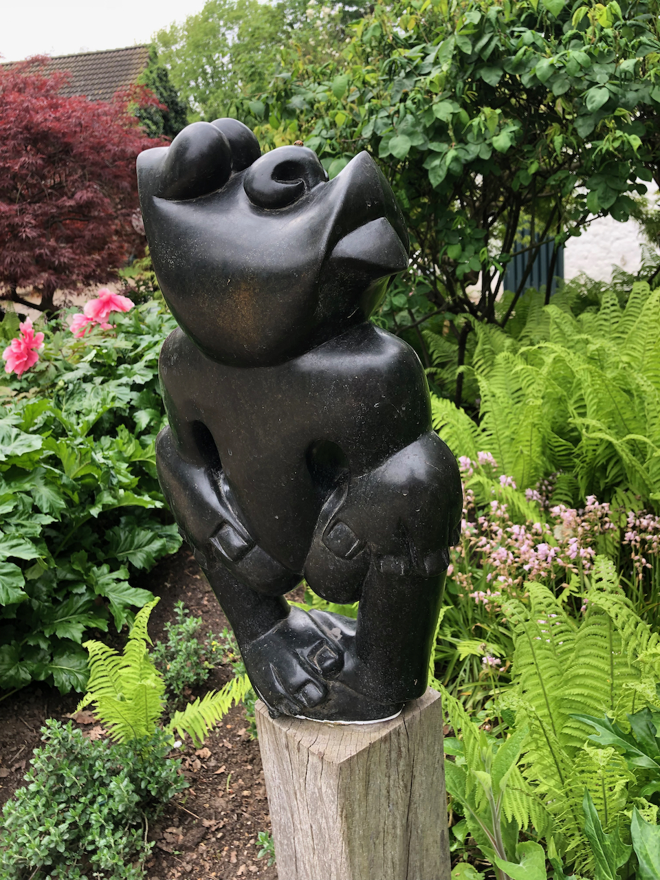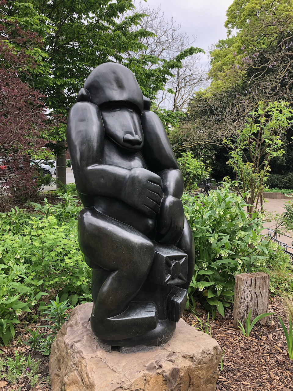 Am Eingang wacht der Pavian, auch über die ganze Anlage sind die Steinskulpturen afrikanischer Künstler verteilt. Bei der Kasse bekomme ich eine kleine Münze: Ein Spenden-Euro für den Naturschutz, den ich bei den Trampeltieren einwerfen kann.
