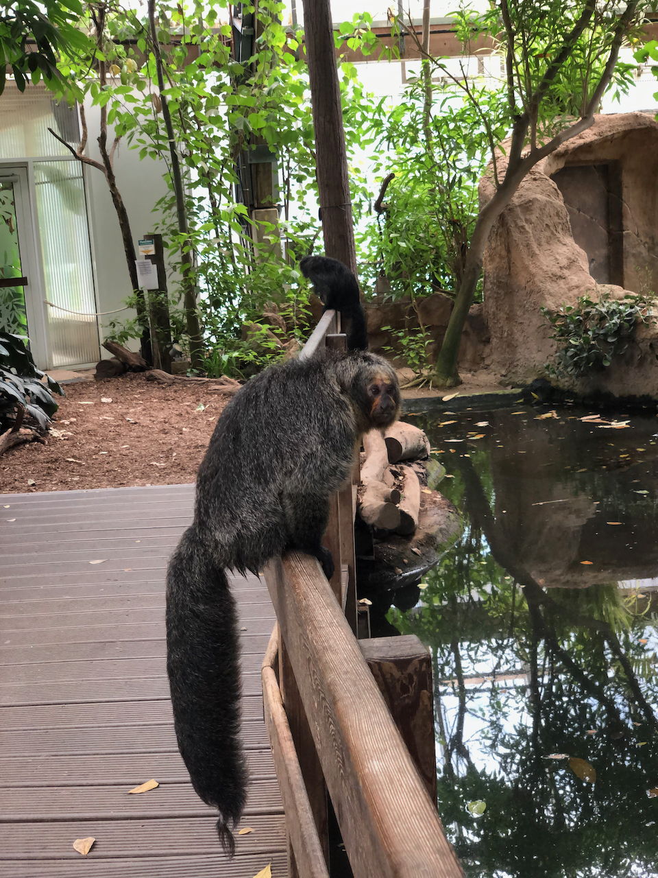 Gleich nebenan: frei fliegende Schmetterlinge im Schmetterlingshaus und die kleinen Weißgesichts-Sakis im Regenwaldhaus machen sich wohl einen Spaß daraus, Besucher zu erschrecken, indem sie urplötzlich dich an ihnen vorbeispringen.