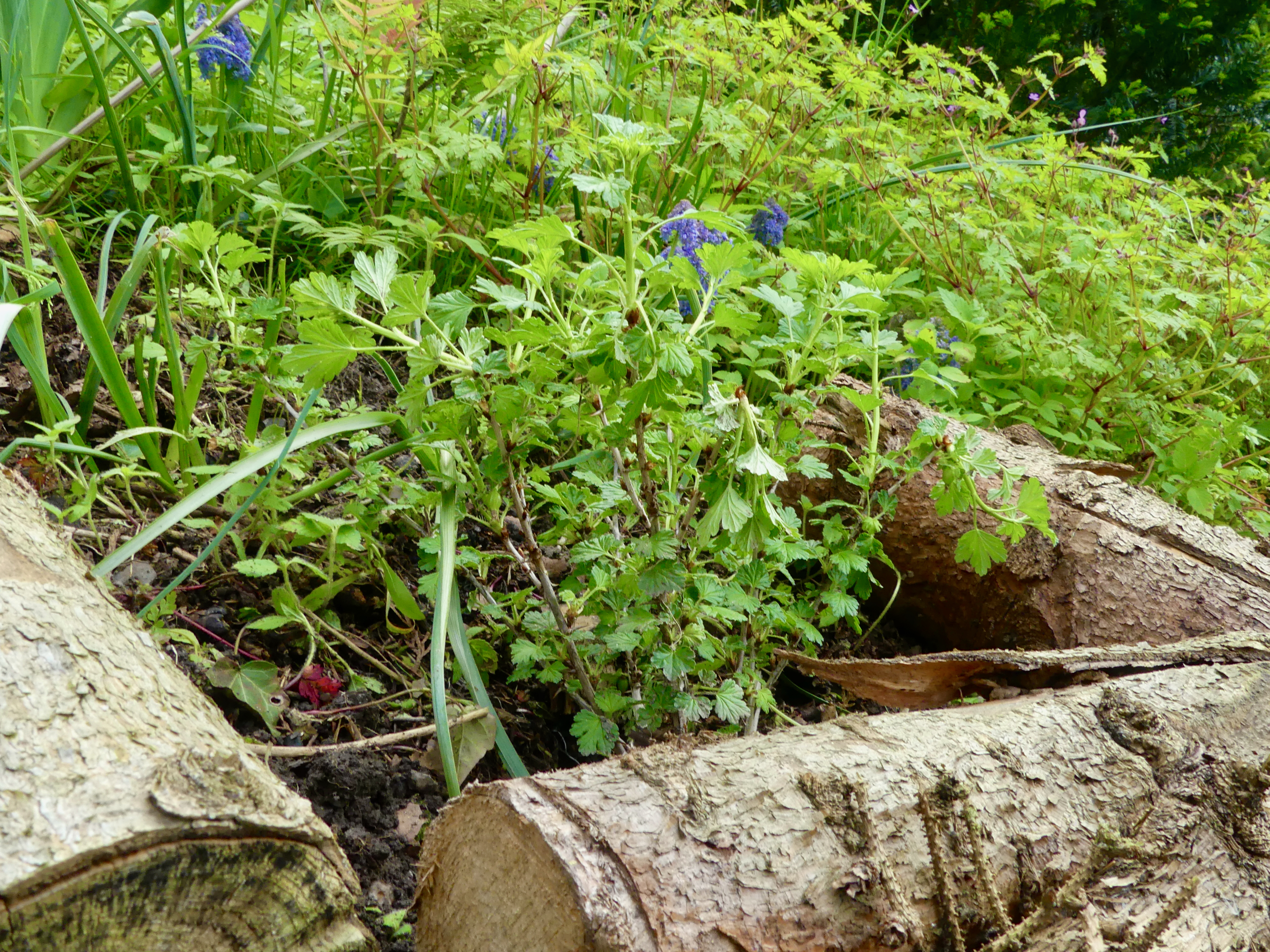 Und da ist er nun: Der kleine Stachelbeerstrauch, der unbedingt mitwollte, der es auf sich genommen hat, mit mir Schwebebahn zu fahren, spazieren zu gehen, ein Bookcrosser-Treffen zu besuchen nur um in diesem Garten zu landen.