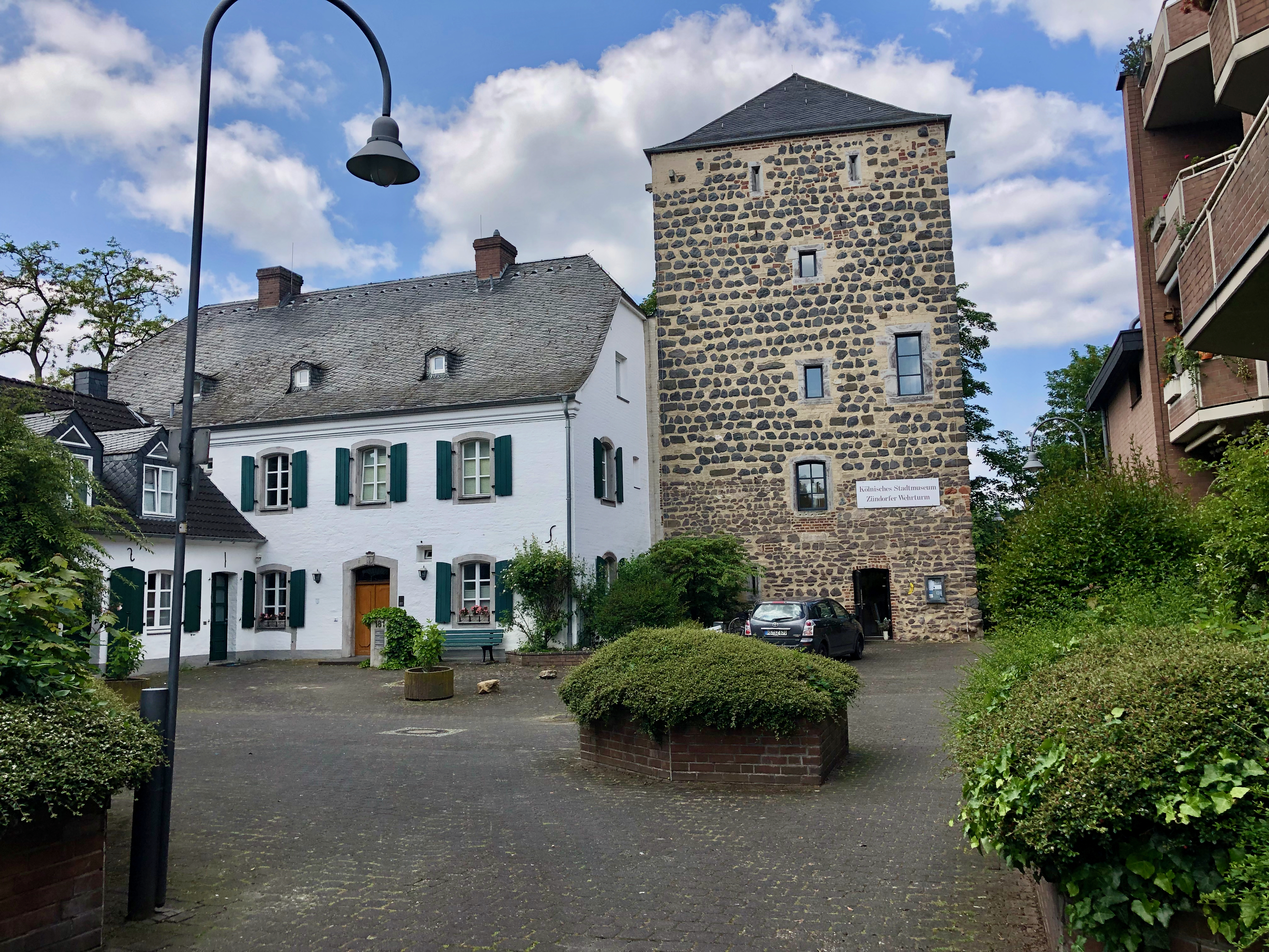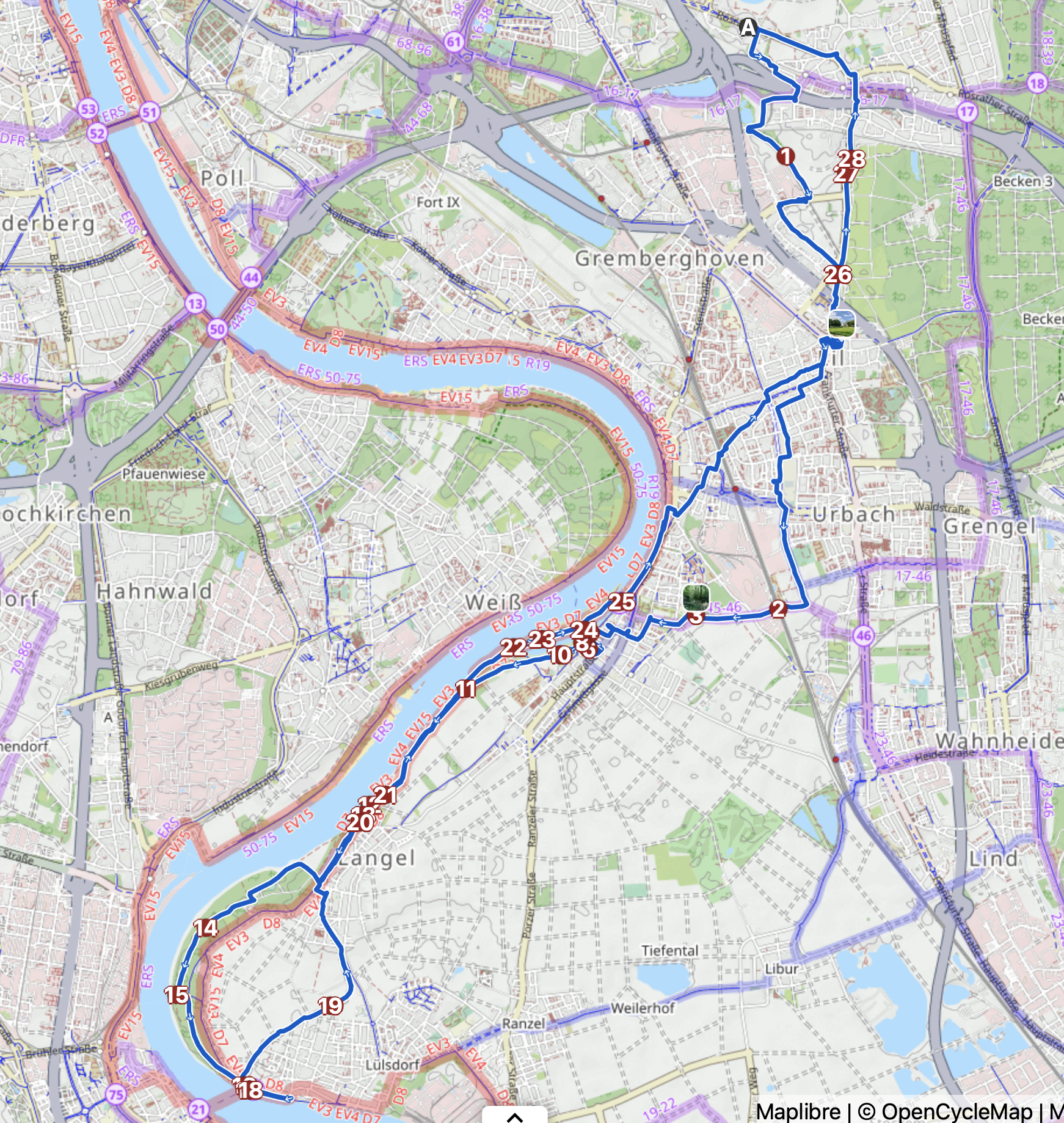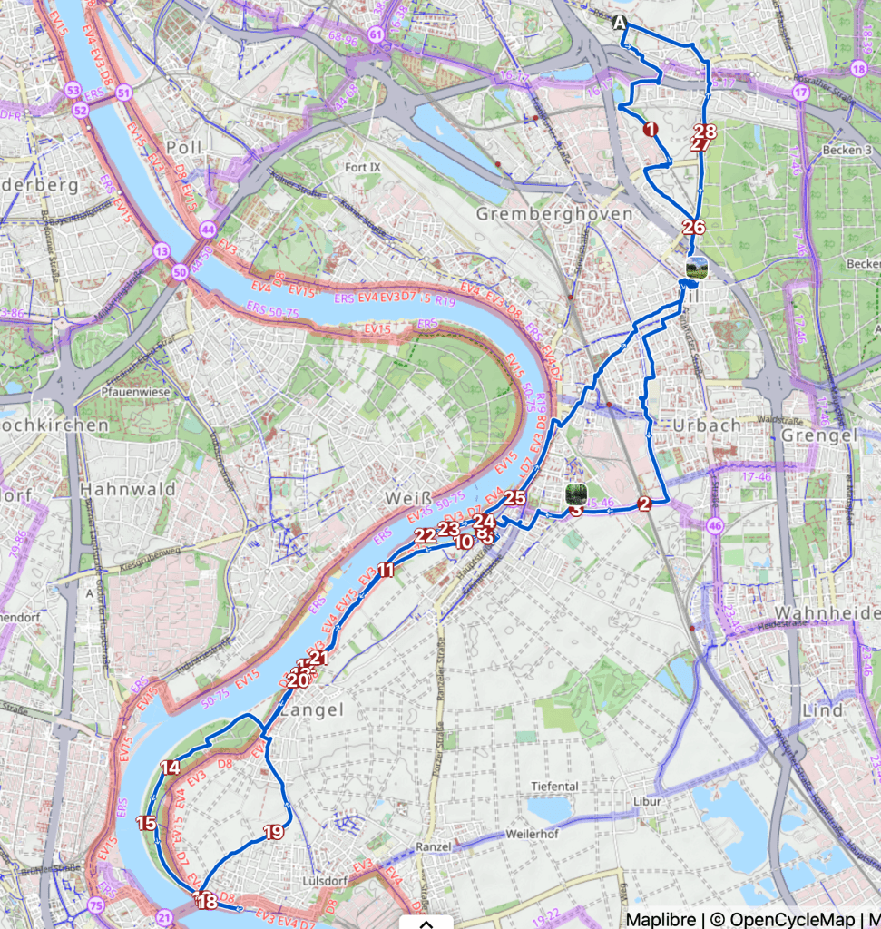 Da wäre ich jetzt nicht drauf gekommen, obwohl ich hier aufgewachsen bin und jetzt auch schon wieder 10 Jahre hier wohne. Aber ein freundlicher Mensch hat ihn auf Komoot als Streckenhighlight markiert. Und das wiederum habe ich gefunden, als ich voriges Jahr von Karlsruhe den Rhein abwärts kommend in Zündorf Richtung Eil abgebogen bin. Aus der Aufzeichnung von damals wollte ich dann in umgekehrte Richtung eine autoarme Strecke Richtung Porz oder Zündorf basteln. Denn so, wie ich vorher immer fahren musste und was von Komoot auch so vorgeschlagen wurde, war einfach nur grottenschlecht. Die erste Testfahrt, da hatte ich in Porz was zu erledigen, war auch schon viel besser. Dem Spieltrieb folgend fand ich bei der Verfeinerung auch die kleine rote Linie.