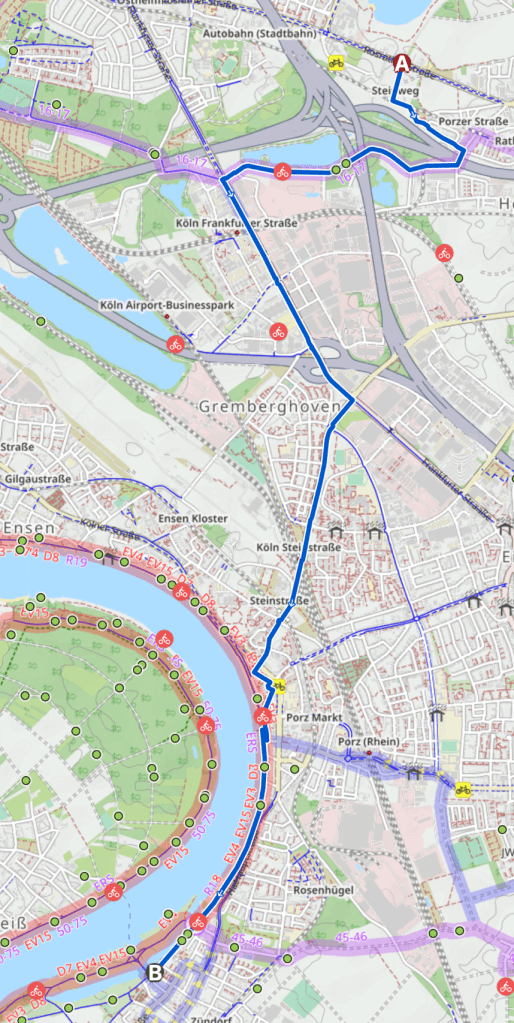 Zum Vergleich: das passiert, wenn man auf Komoot nur Start und Ziel eingibt: Alter Deutscher Postweg = LKW Rennstrecke, Frankfurter Straße = Hauptstraße, Steinstraße = viel befahrene Hauptstraße ohne Schutz mit besonders ätzender Unterführung, der Rest ist Rheinufer.