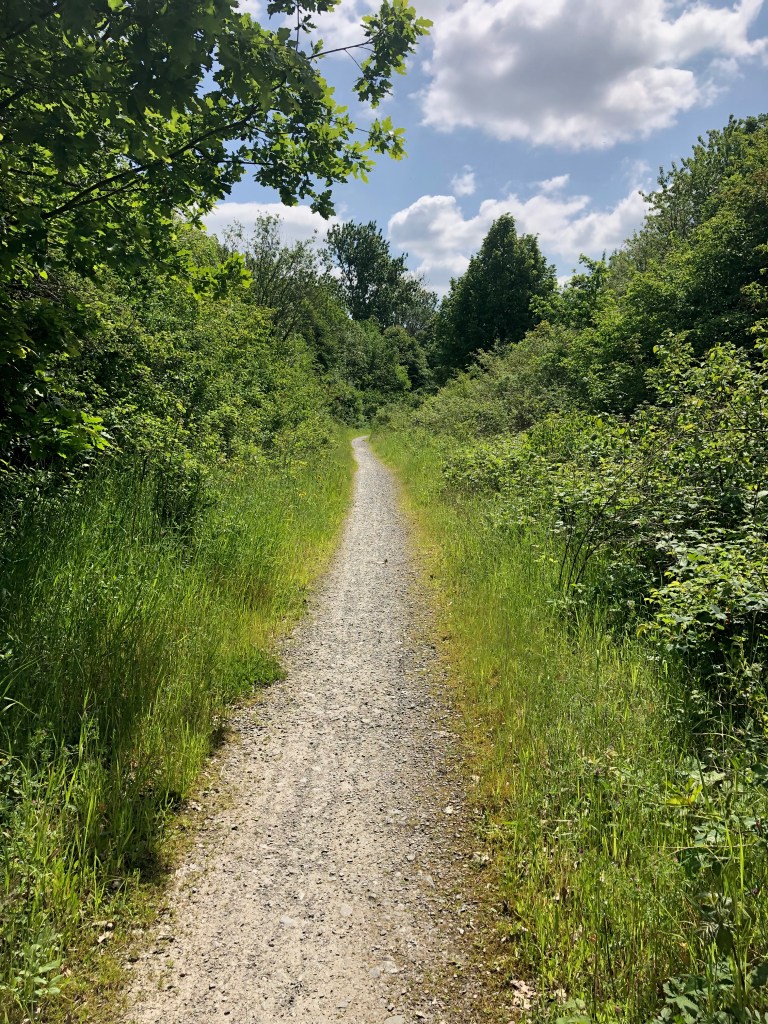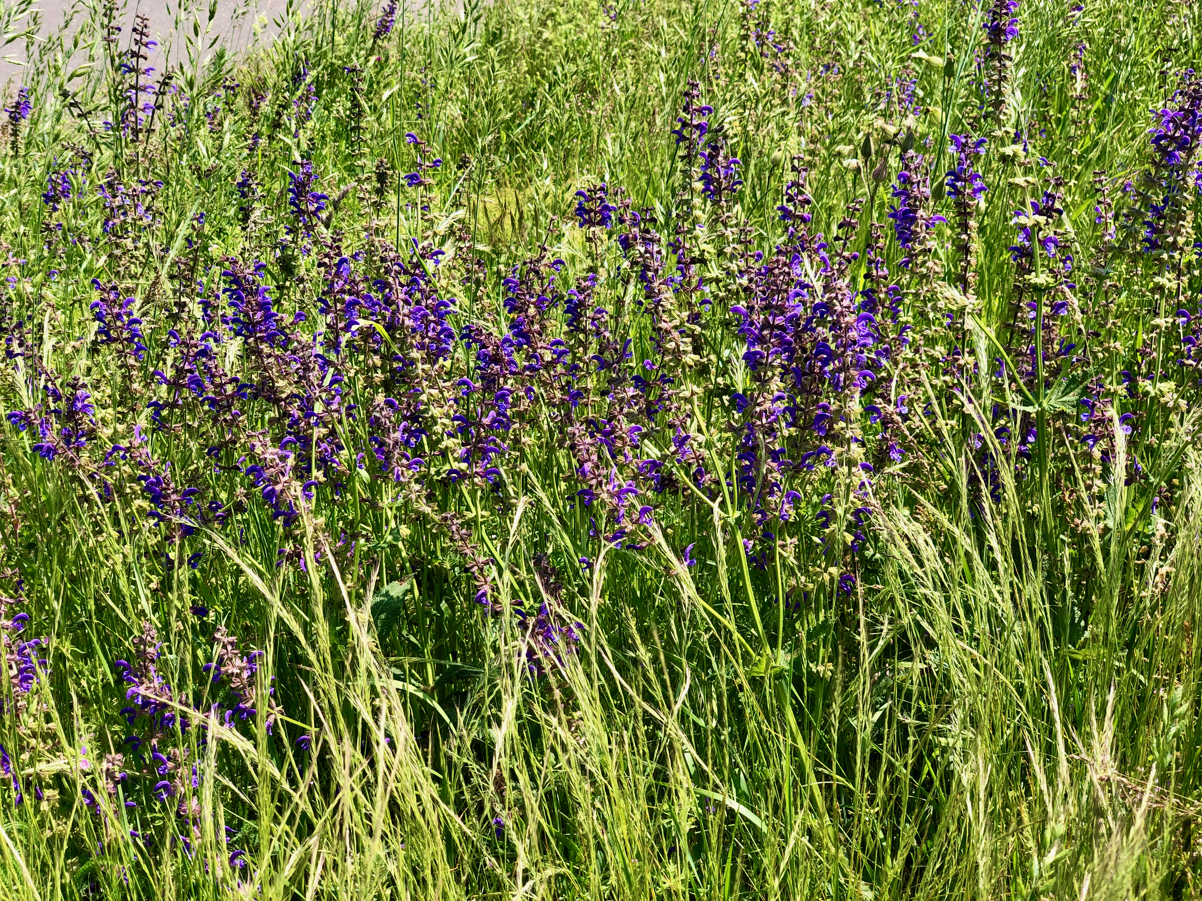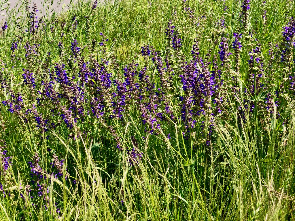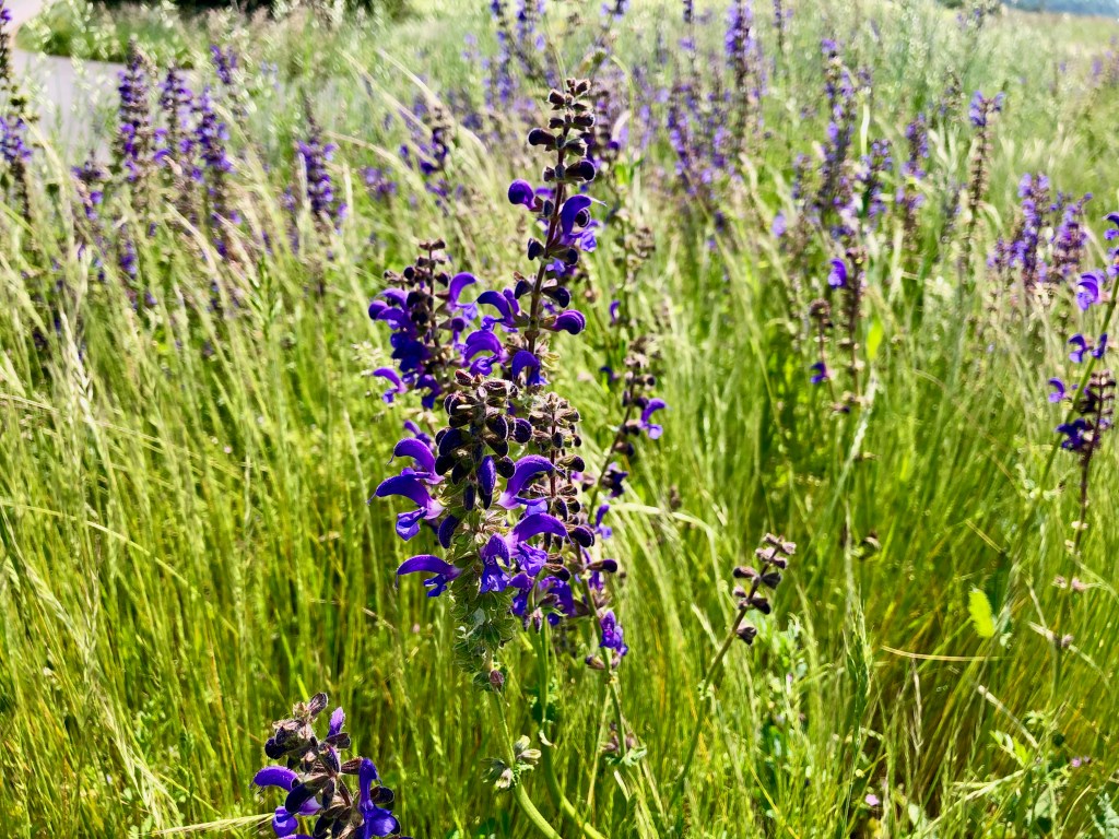 Hier blüht der Wiesensalbei, den ich gern auf meiner Wiese hätte. Mir steht der Sinn nach Samenklau. Auf dem Rückweg probiere ich noch eine Abkürzung aus und finde noch eine Fußgängerbrücke über die Bahn und eine sehr kurze, fahrbare Verbindung zwischen Porz und Rath.