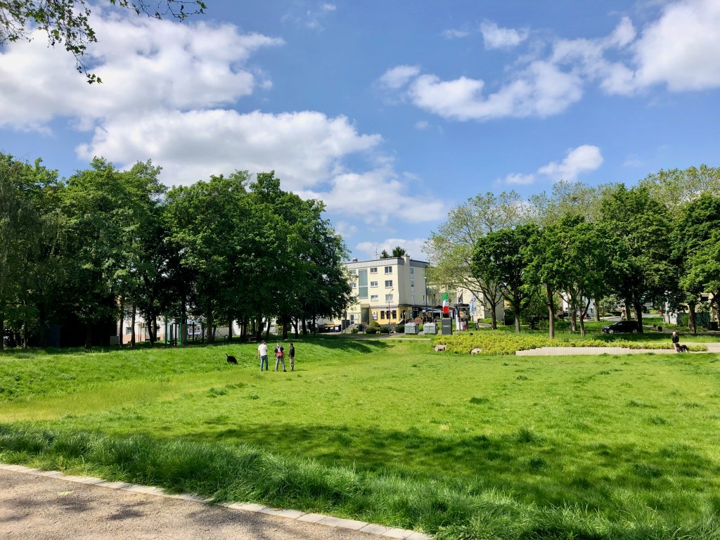 Überraschung! Als ich das letzte mal hier war, war da eine fiese Baustelle und jetzt ist aus dem immer etwas schmuddeligen Schützenplatz eine schmucke, kleine Grünanlage mit Kinderspielplatz, Tischtennisplatte, Bänken und Retentionsbecken geworden.