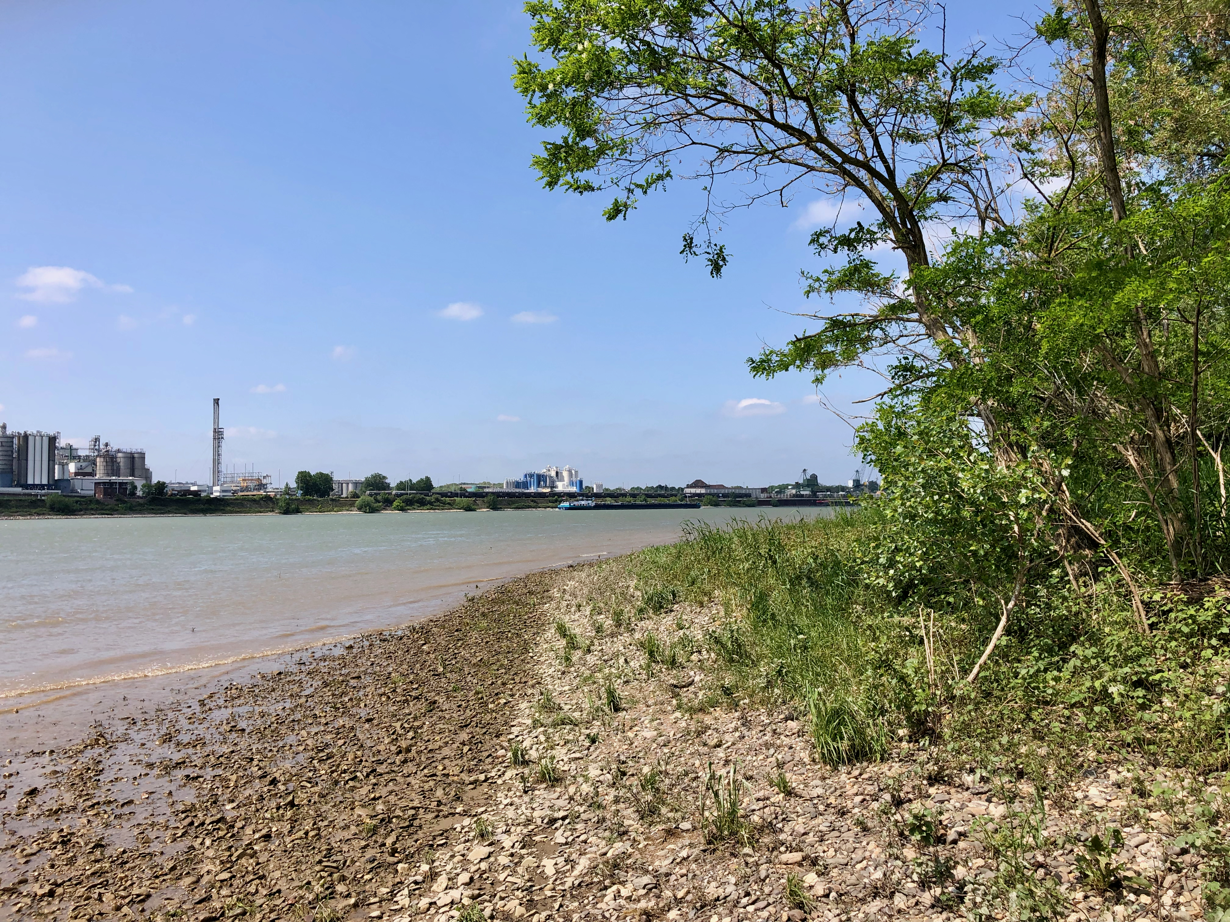 Am Langeler Lido macht der Rhein sich breit in seinem Bett, gegenüber das Industriegebiet von Godorf und Wesseling. In Lülsdorf kehre ich um und probiere noch einen gegenwindigen Damm zwischen Lülsdorf und Langel aus.