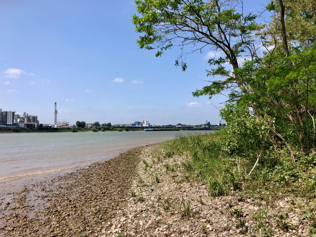 Und schon bin ich unten an der Groov. Das war jetzt nicht die kürzeste Strecke und schon gar nicht die offizielle, aber angenehm zu fahren. Ab hier lasse ich Komoot nur noch aufzeichnen. Ich überlege, wieder mit dem Krokodil den Rhein zu queren, habe aber irgendwo im Hinterkopf, dass die Rodenkirchener Brücke gerade nicht oder schlecht befahrbar ist. Also fahre ich einfach ein Stück den Rhein hoch. Dieses Mal nicht über den schicken Damm, sondern die Hubbelpiste durch den dunklen Auwald. Das Naturschutzgebiet ist durch die geplante Autobahnquerung bedroht.