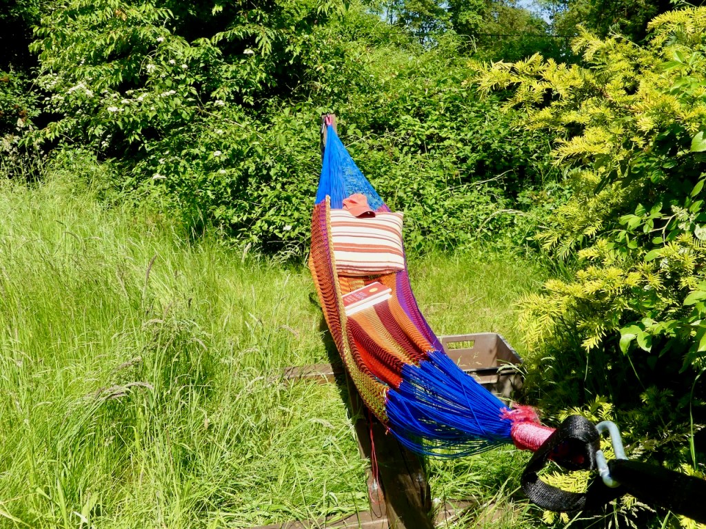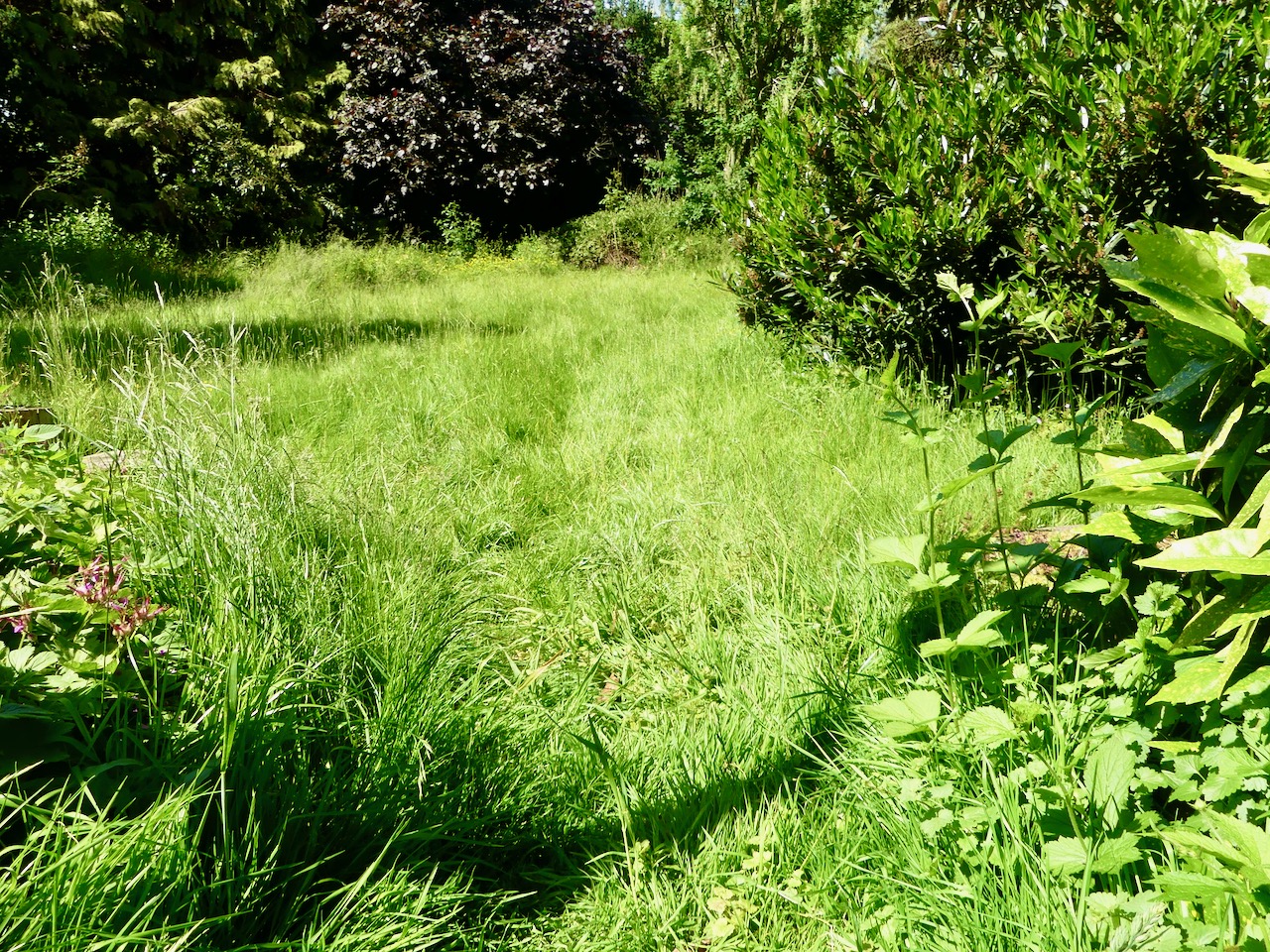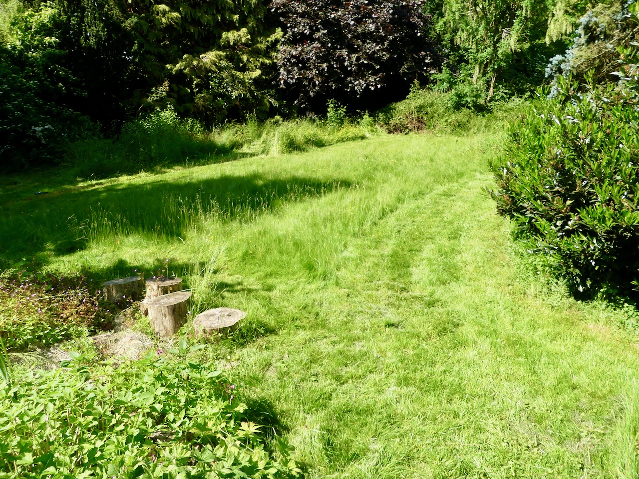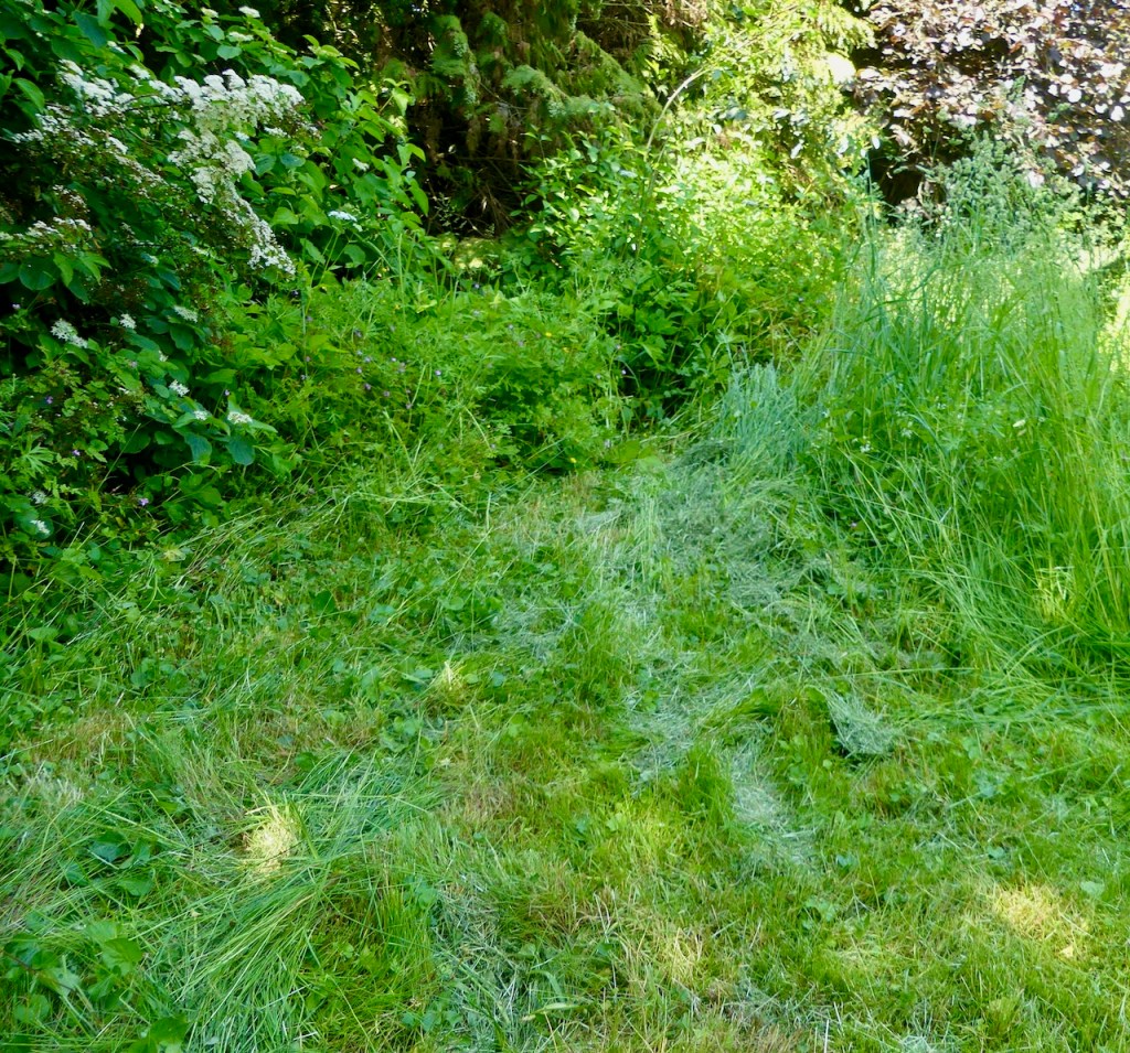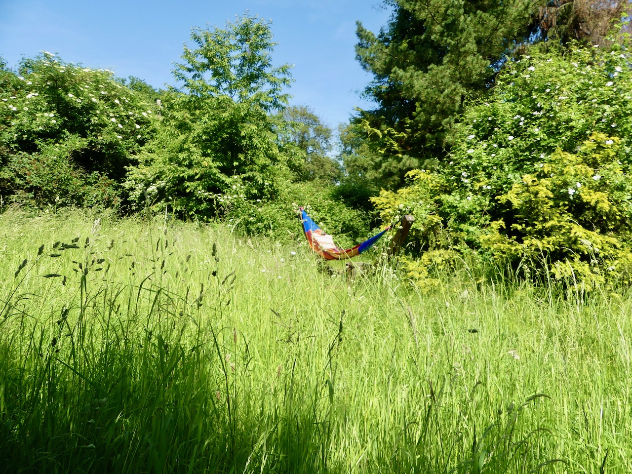 Auf dem Seitenstreifen hingegen und am Rand der Wiese, sind bibohohe, zähe Gräser in die Höhe geschossen. Der Rasenmäher quält sich, das Hängemattengestell ist komplett eingewachsen und teilweise im Boden versunken.