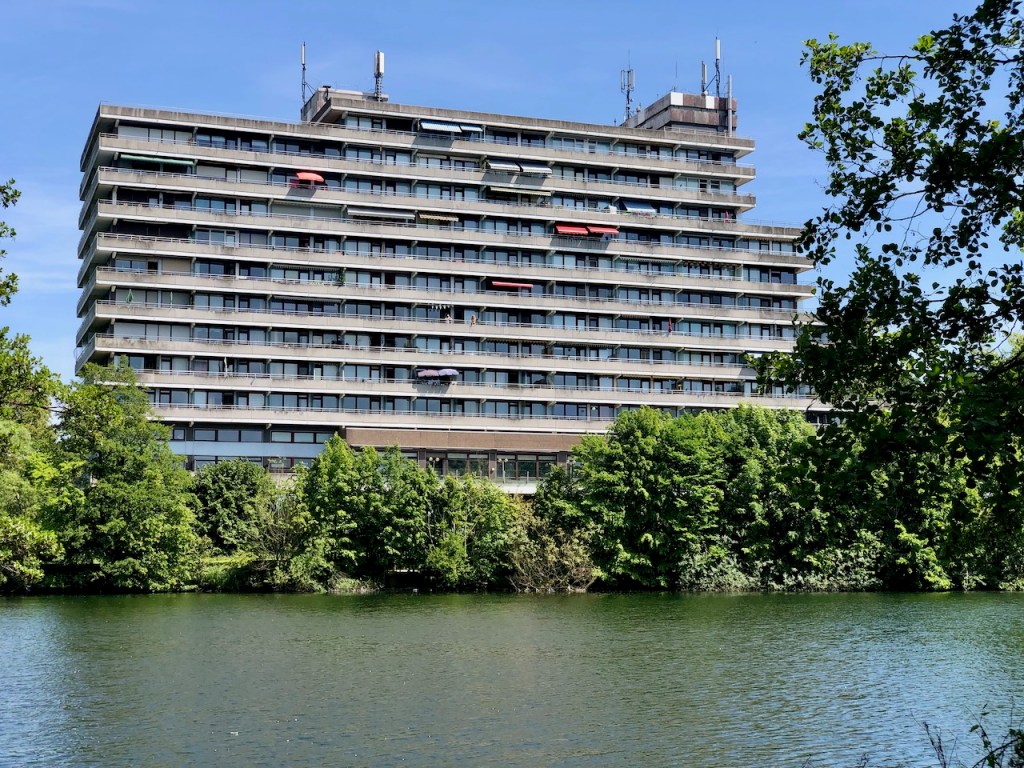 In den ganzen idyllischen Beschreibungen von Bad Malente-Gremsmühlen ist dieses Scheusal nicht erwähnt, auf Fotos dezent abgeschnitten. Es sieht auch ziemlich leerstehend aus. Aber: Als ich am nächsten Tag einen der Schipper frage, ob das Scheusal wohl mal abgerissen wird, bekomme ich zur Antwort: „Da gibt es über 50 Eigentümer und manche finden das schön. Bis die sich geeinigt haben, fällt das von alleine um. Und wenn die sich geeinigt haben, kommt bestimmt irgendso ein Grüner und behauptet, das könne man nicht sprengen, weil hier alles unter Naturschutz steht.“ Den Unsinn mit den Grünen hätte er sich sparen können. Das mit den Eigentümern stimmt leider. Wenn sie wenigstens ihre idyllisch gelegenen Balkone begrünen würden, wäre der Brutalismus vielleicht nicht ganz so brutal.