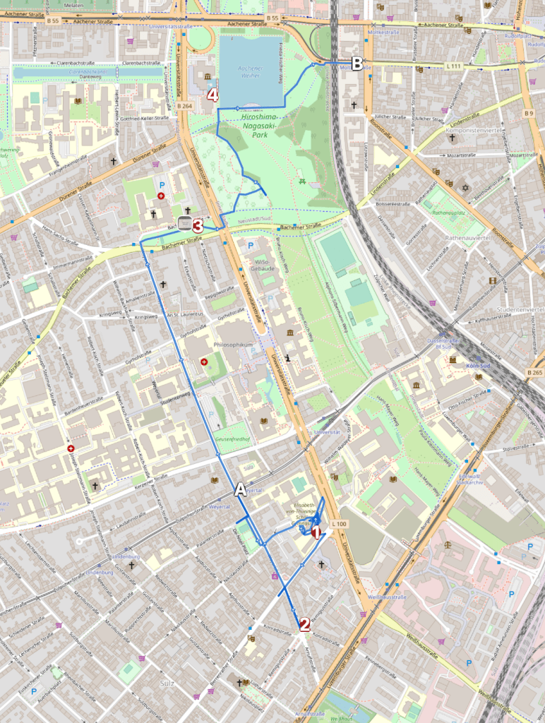 Er mündet an der Universitätsstraße in den erheblich größeren Hiroshima und Nagasaki Park der Teil des inneren Grüngürtels ist.