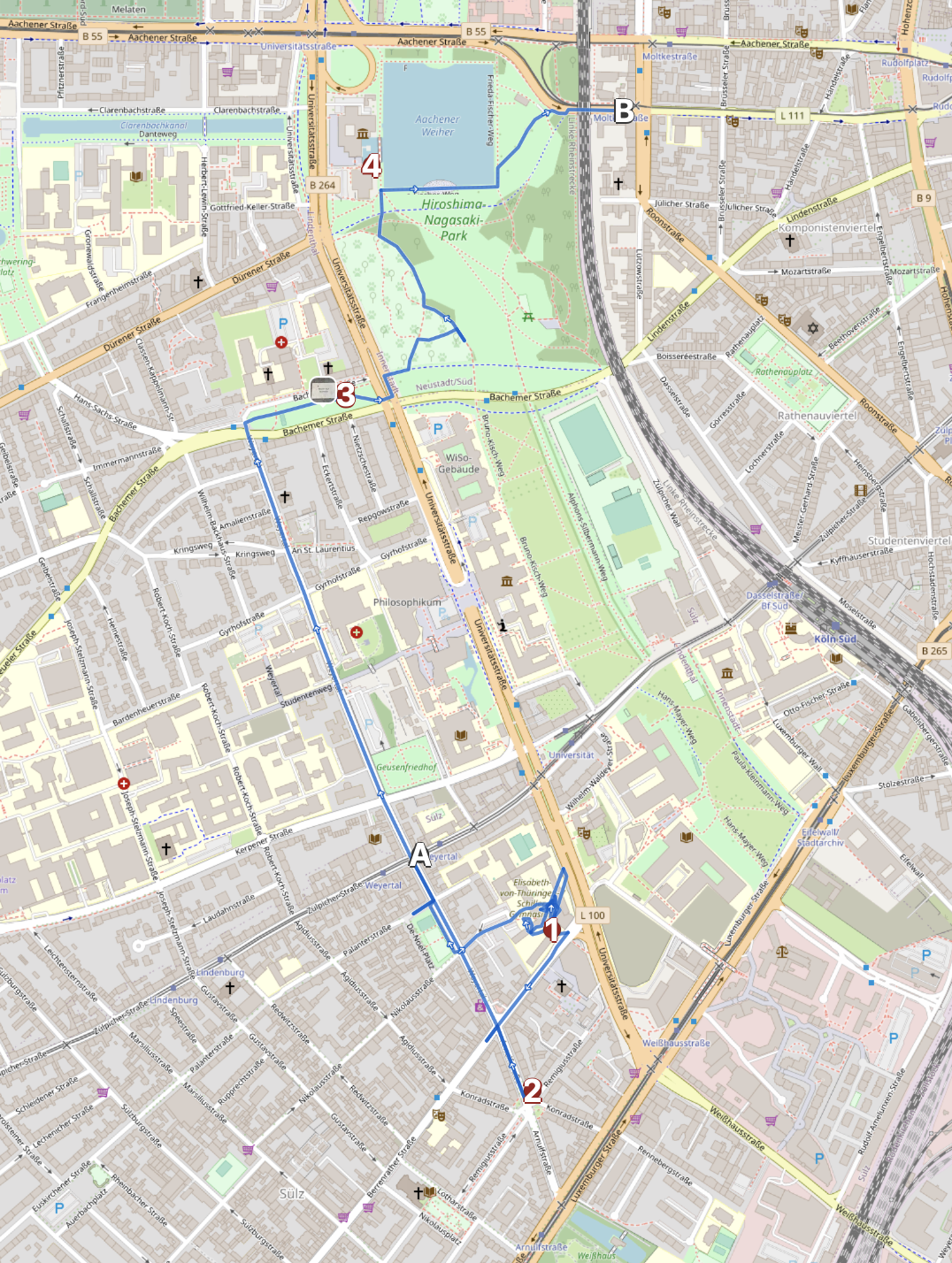 Er mündet an der Universitätsstraße in den erheblich größeren Hiroshima und Nagasaki Park der Teil des inneren Grüngürtels ist.