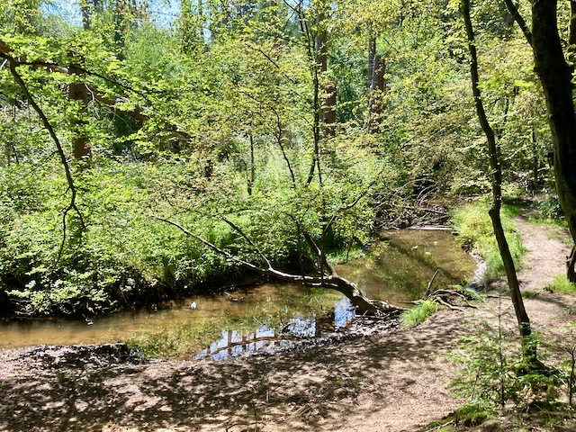 Schweine und Hirsche waren nicht zu sehen, aber beim Hirschgehege fand ich eine von diesen bequemen Holzliegen und habe eine ganze Weile im Wald gesessen und gelesen. Abschließend gab es noch ein Eis in Brück.
