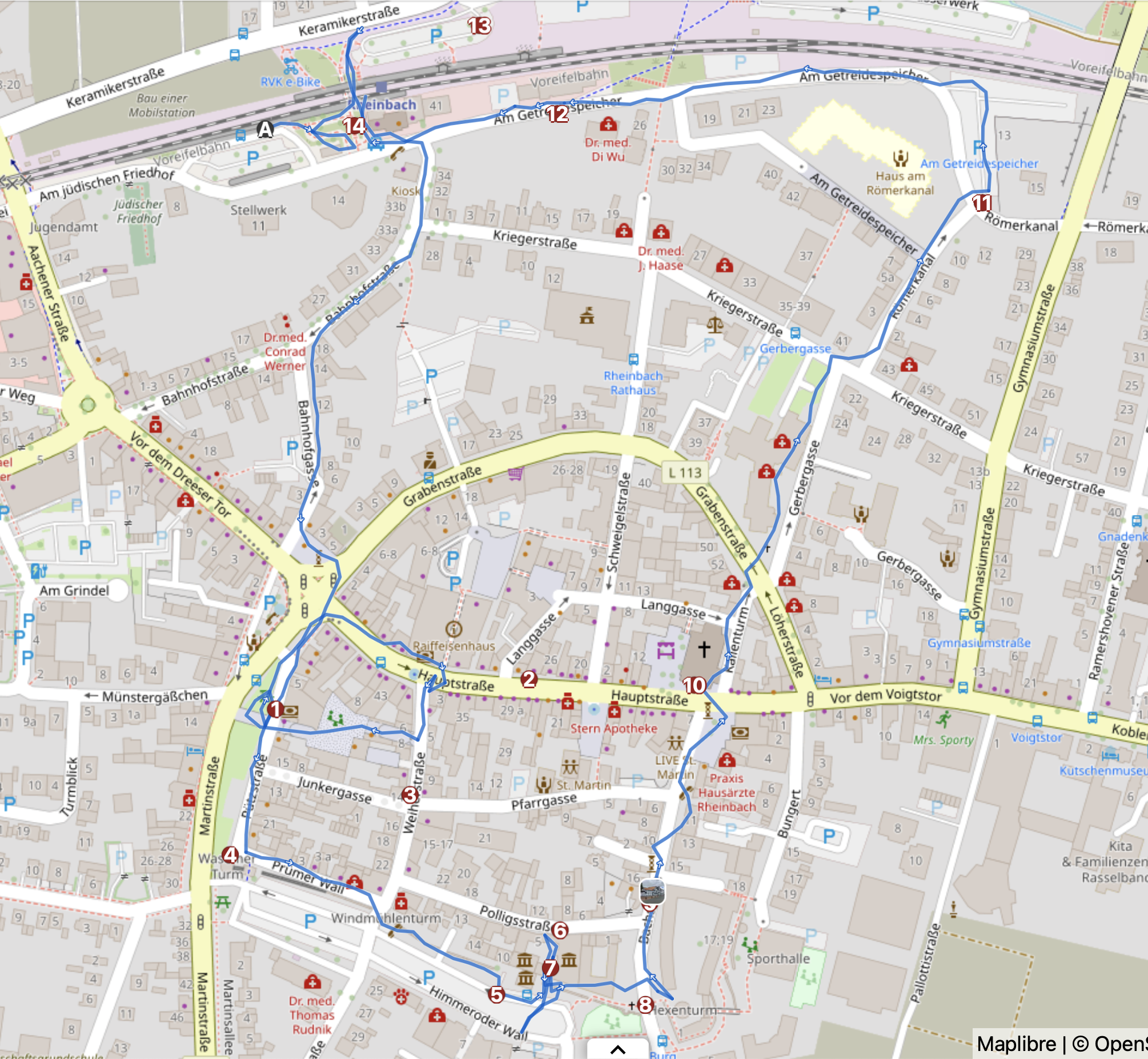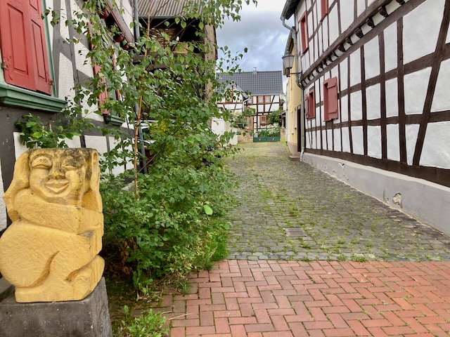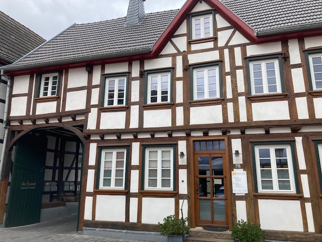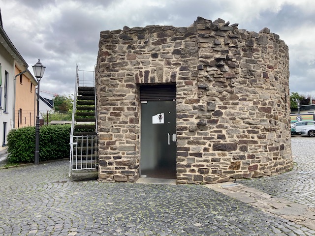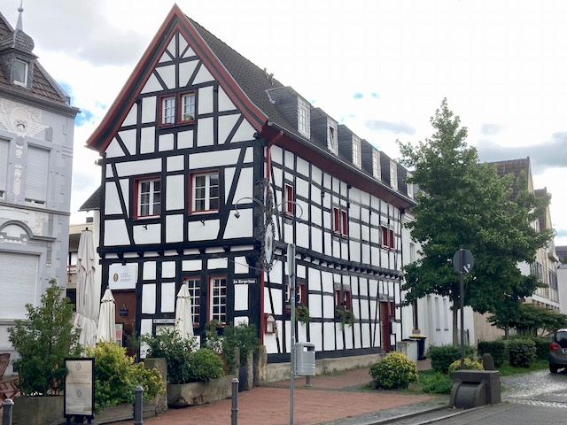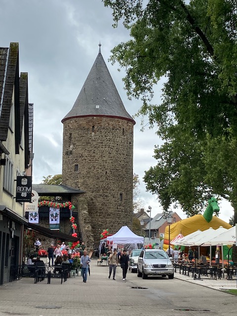 Ich werde positiv überrascht, in zweierlei Hinsicht. Es gibt eine lebendige Altstadt, mit feinem Fachwerk, am Wasemer Turm feiert das Stadtsoldatencorps 1905 Rheinbach e.V., und als ich mal schauen will, wo das Museum liegt, zeigt mir Komoot den Römerkanal-Wanderweg auf einer Wanderkarte an. Sollte er eigentlich nicht, denn „Premium“ habe ich abbestellt. Ein „Fehler“ zu meinen Gunsten oder muss das jetzt so? Besser nicht hinterfragen. (Auch am Morgen danach zeigt das Tippeldings Fernwander- und -Radwege an, nicht aber der Klappmäc.)