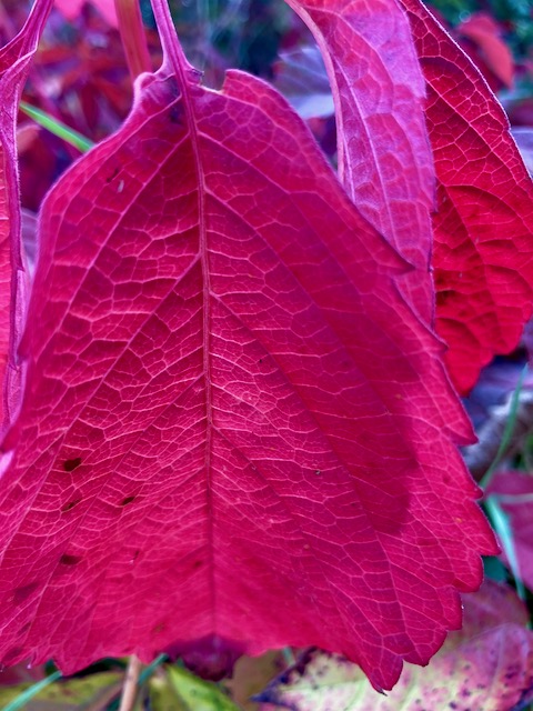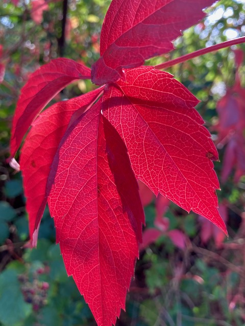 Die selbstkletternde Jungfernrebe war auch errötet über Nacht. Sie wird auch als wilder Wein bezeichnet, was es nicht so ganz trifft, aber fast. Sie gehört zwar zur Familie der Weinrebengewächse, gehört aber einer anderen Gattung an als die Weinrebe Vitis vinifera . Man kann sich den Verwandtschaftsgrad in etwa vorstellen wie bei Vettern und Kusinen. Hübsch rot ist sie ja, aber eingebürgert, denn ihr eigentliches Verbreitungsgebiet ist Nord- und Mittelamerika. Als Zierpflanze kam sie und funktioniert bestens zur Fassaden und Dachbegrünung. Hier hängt sie sich aber auch in manche Bäume und Sträucher. Ich bin mir also nicht ganz sicher, ob sie ein Neophyt ist oder ein invasiver Neophyt.