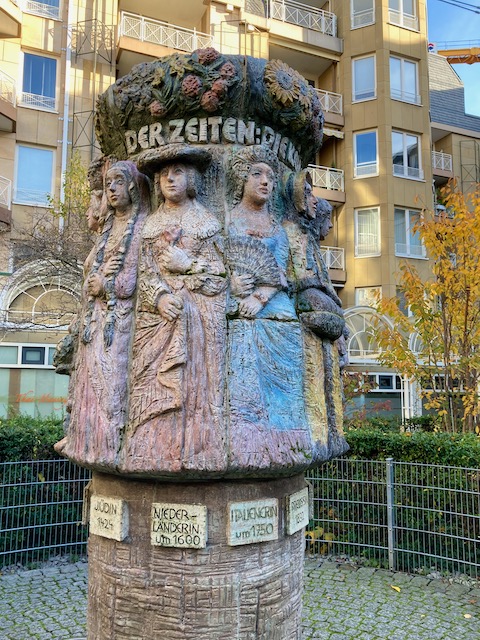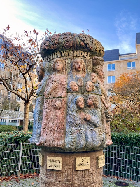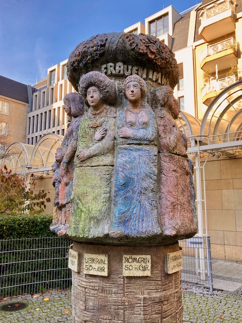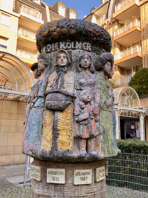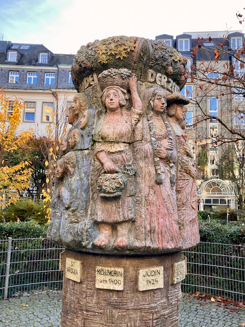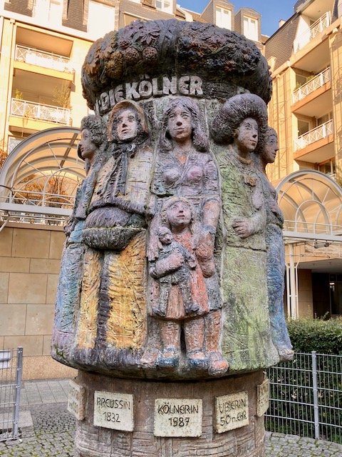 Es ist der Garten im Innenhof an Farina. Privatgelände, aber öffentlich begehbar. Er gehört zum Geburtshaus des kölnisch Wasser, „Eau de Cologne“ auf fein. Neben blühenden Beeten steht auch der Frauenbrunnen, der eigentlich „Die Kölner Frauen im Wandel der Zeiten“ heißt. Die Künstlerin Anneliese Langenbach hat die Frauen in der für ihre jeweilige Zeit typischen Kleidung dargestellt.