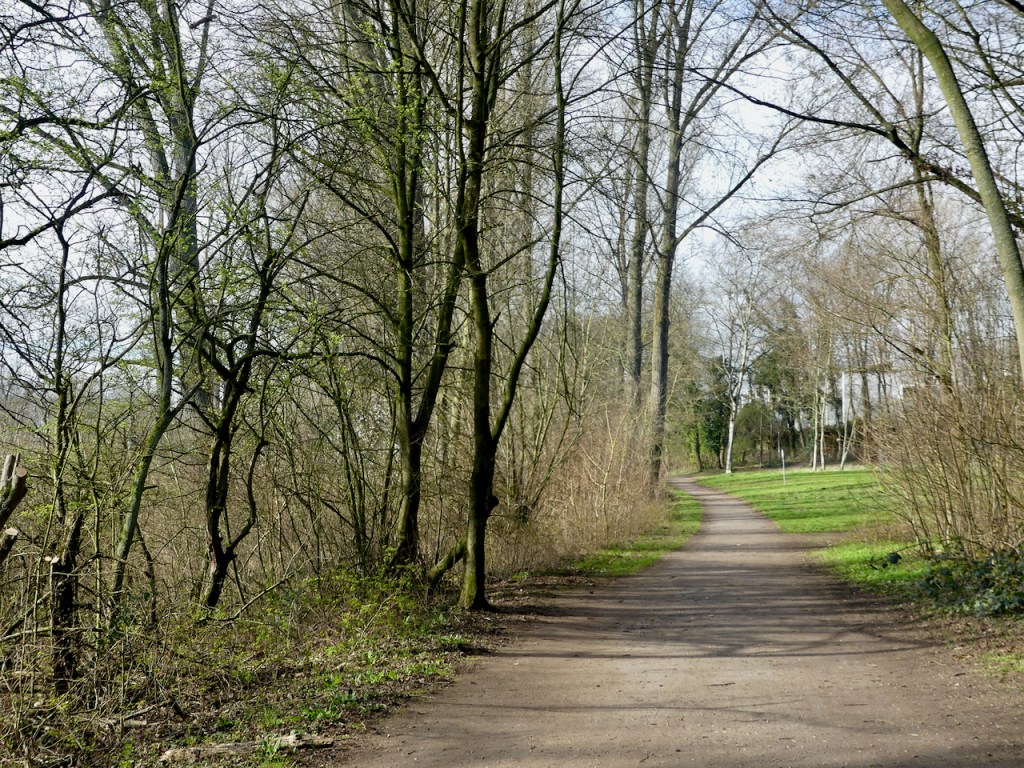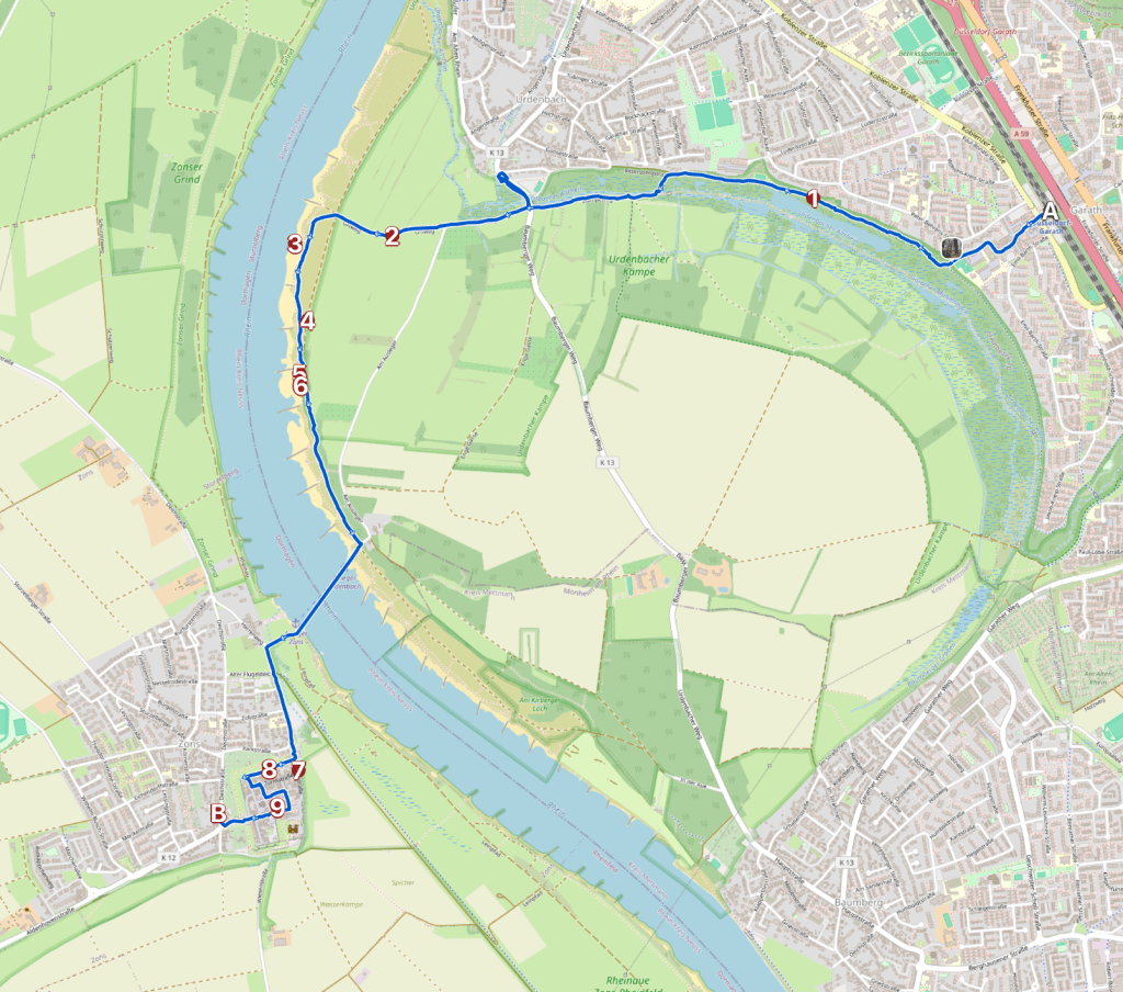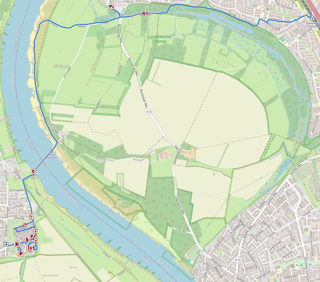 Der Weg beschreibt einen sanften Bogen rechts die Düsseldorfer Wohnbebauung und parkartige Einschübe mit Sitzbänken, links der Altrhein im Naturschutzgebiet. vor siebenhundert Jahren war hier noch das rechte Rheinufer. Erst bei einer Sturmflut, vermutlich im Jahr 1374, durchbrach der Rhein die Fluss-Schlinge und nahm die Abkürzung im Westen.