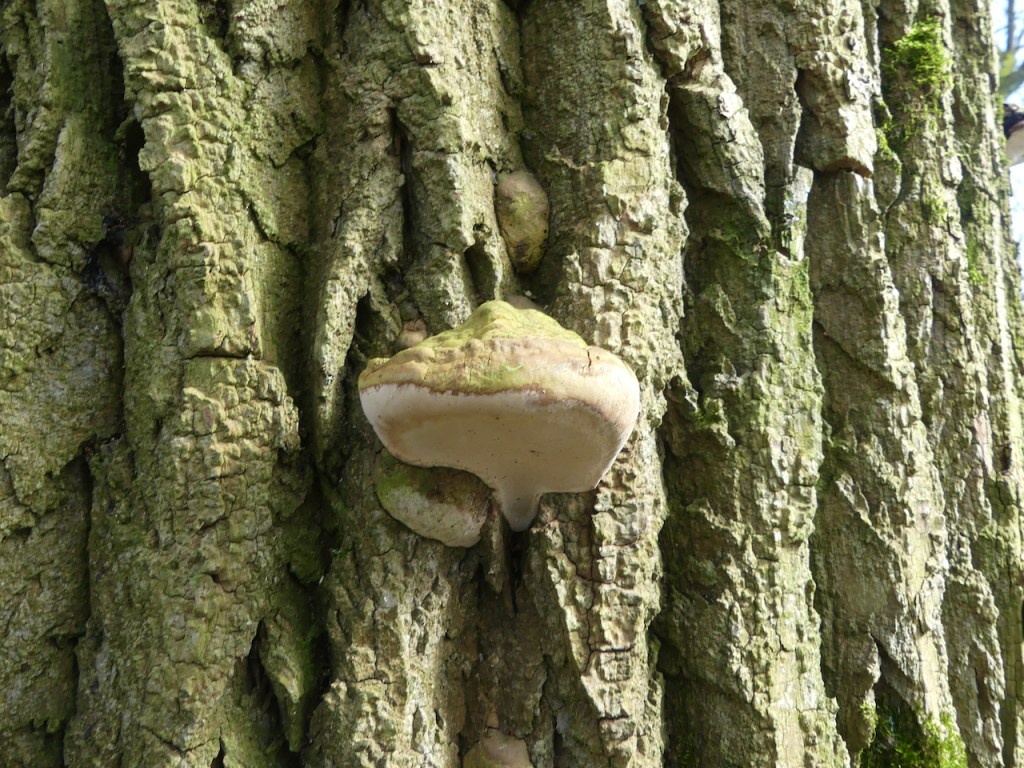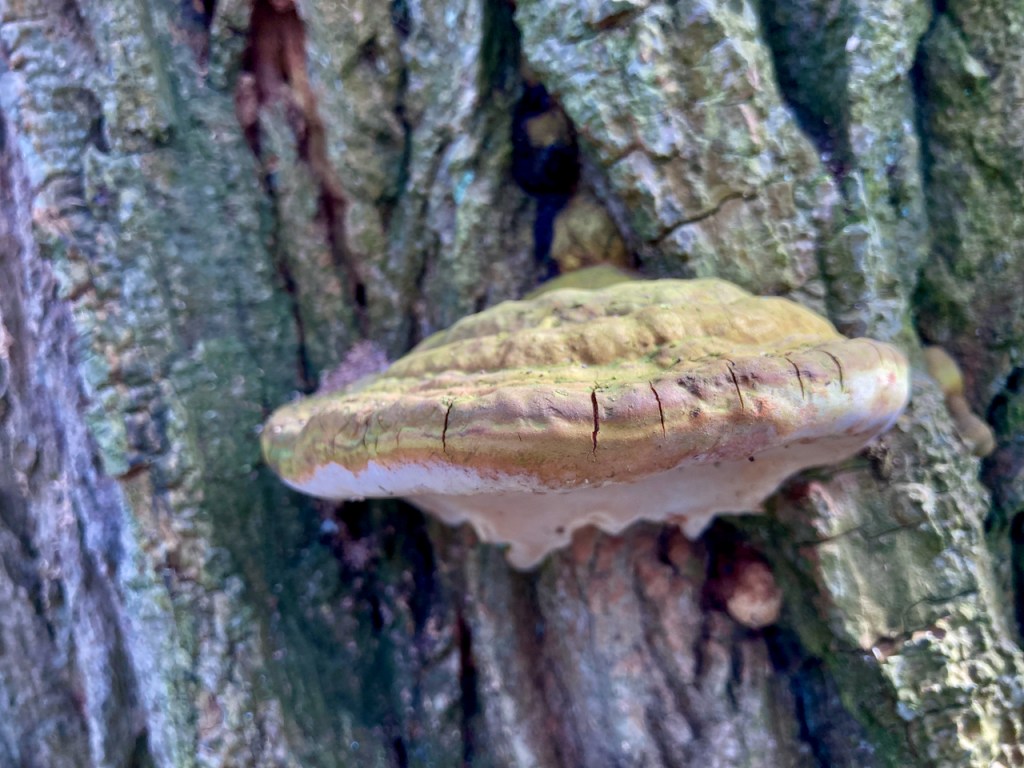 An abgestorbenen Bäumen wachsen irgendwelche Porlinge. Kann Zunderschwamm sein, ich enthalte mich der Stimme. Die größeren sind angeschnitten. Im Naturschutzgebiet! 😡 Sollen ja angeblich gesund sein.